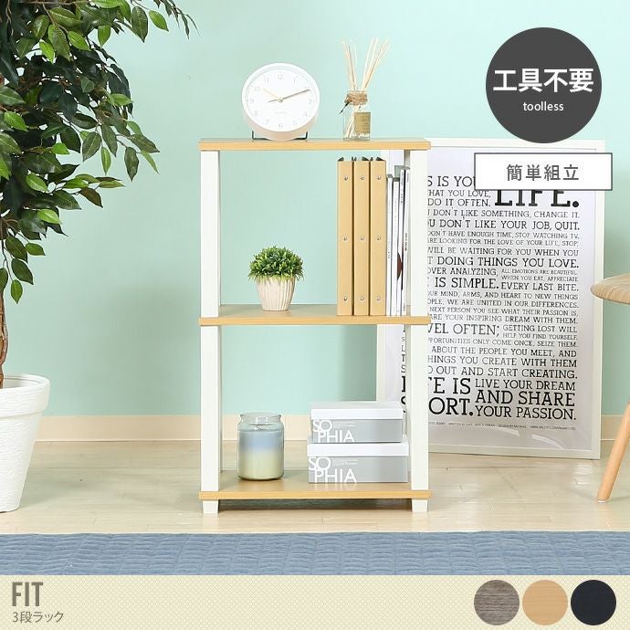 お部屋の間仕切りにも使える『 Fit(フィット)3段ラック』。シリーズ展開豊富なFitシリーズからお洒落な3段ラックが登場しました。工具不要なねじ込むだけの簡単組立。オープンボードでシンプルな作りなので横向きでも縦向きでも隙間に合わせて万能にご利用いただけます。