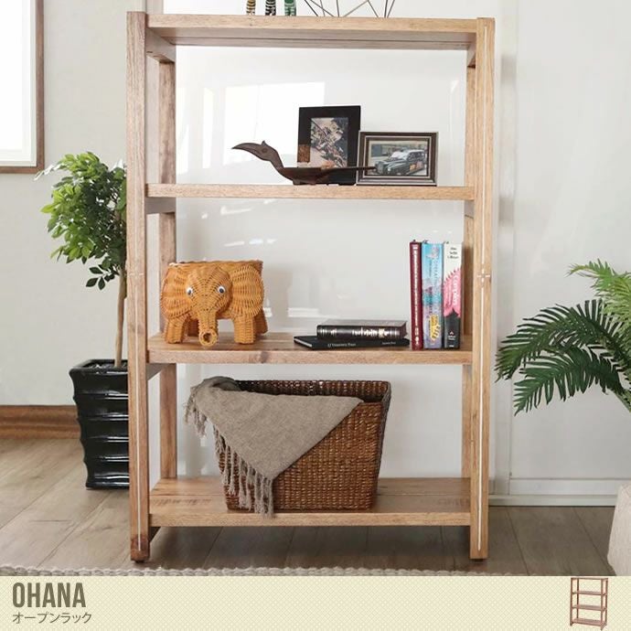 ハワイを感じる個性的な『Ohana』シリーズのオープンラック。木の本来の味やラフさをあえて残した、あたたかみのある質感になっています。シンプルで開放感のあるデザインと、あたたかみ・深みのある質感は相性抜群です。ハワイのタトゥーをイメージした白い彫り模様がアクセントになっており、他にはない独特な存在感を放っています。また、ハワイのアンティークショップに並んでいそうなヴィンテージさも感じられ、西海岸やリゾートテイストにおすすめです。