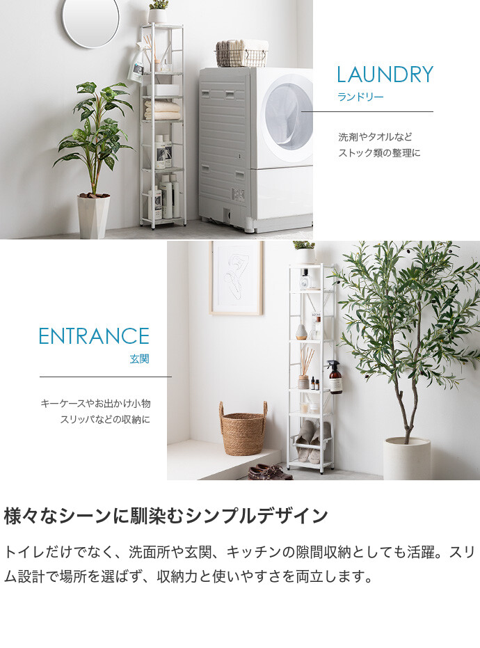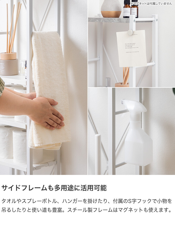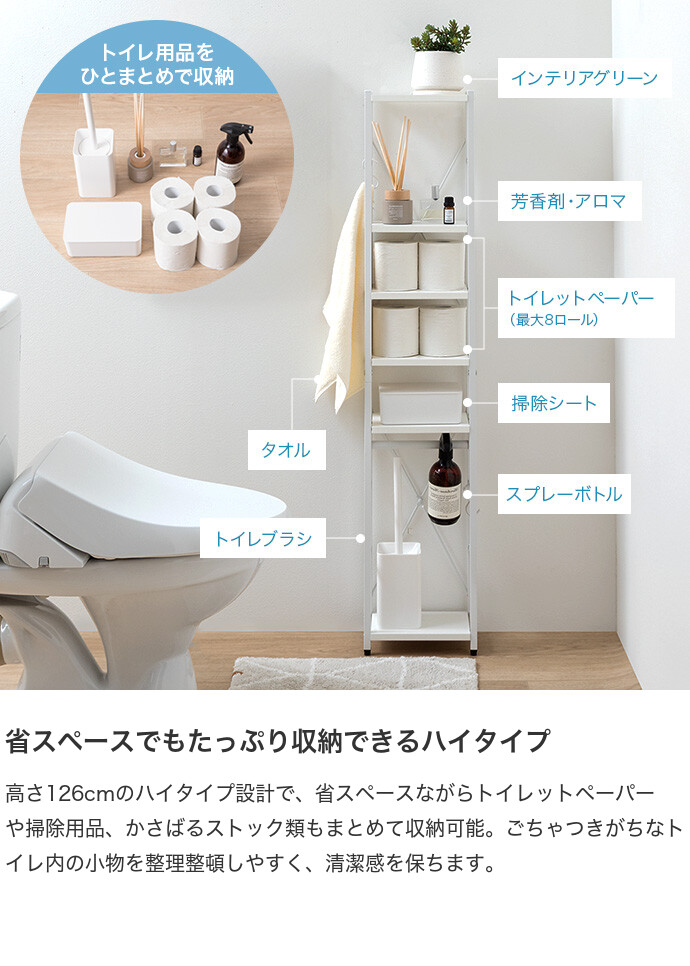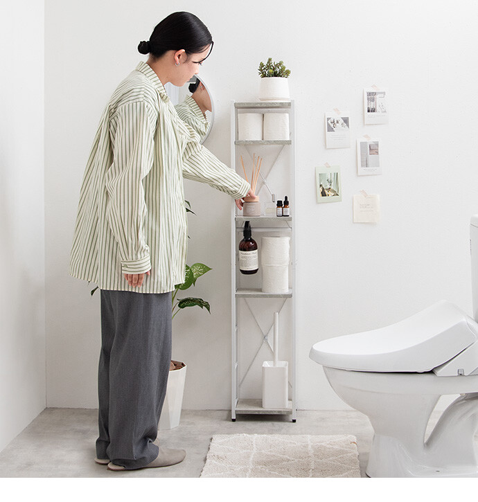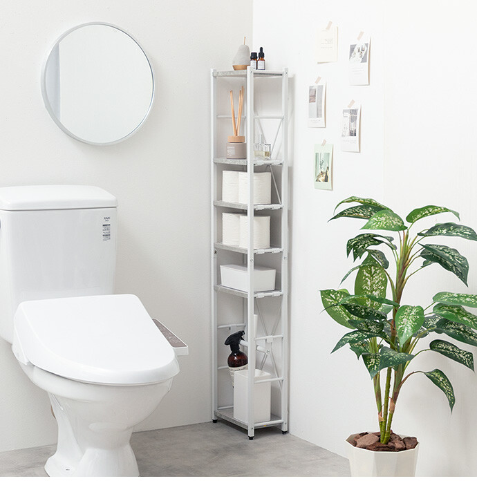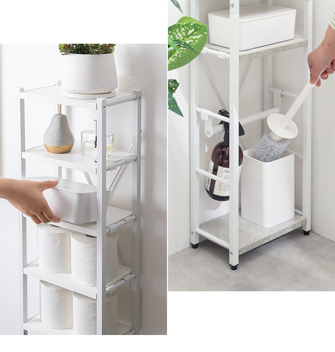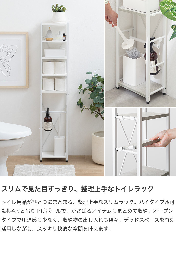トイレ用品がひとつにまとまるスリムトイレラック。ハイタイプ&可動棚4段と吊り下げポールで、かさばるアイテムもまとめて収納。オープンタイプで圧迫感も少なく、収納物の出し入れも楽々。デッドスペースを有効活用しながら、スッキリ快適な空間を叶えます。