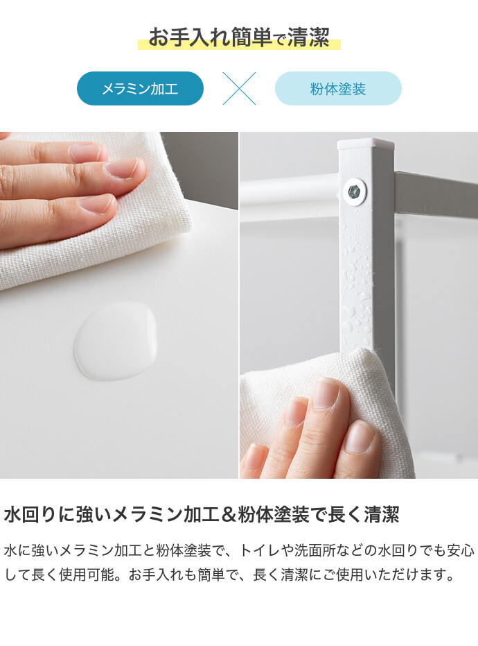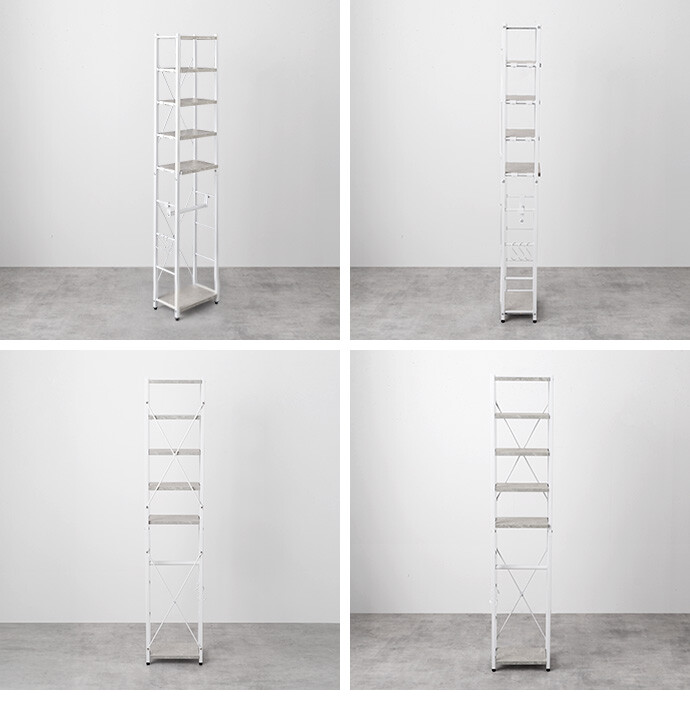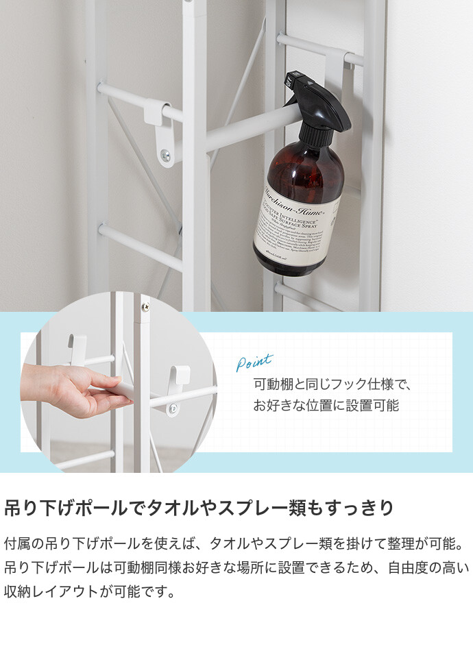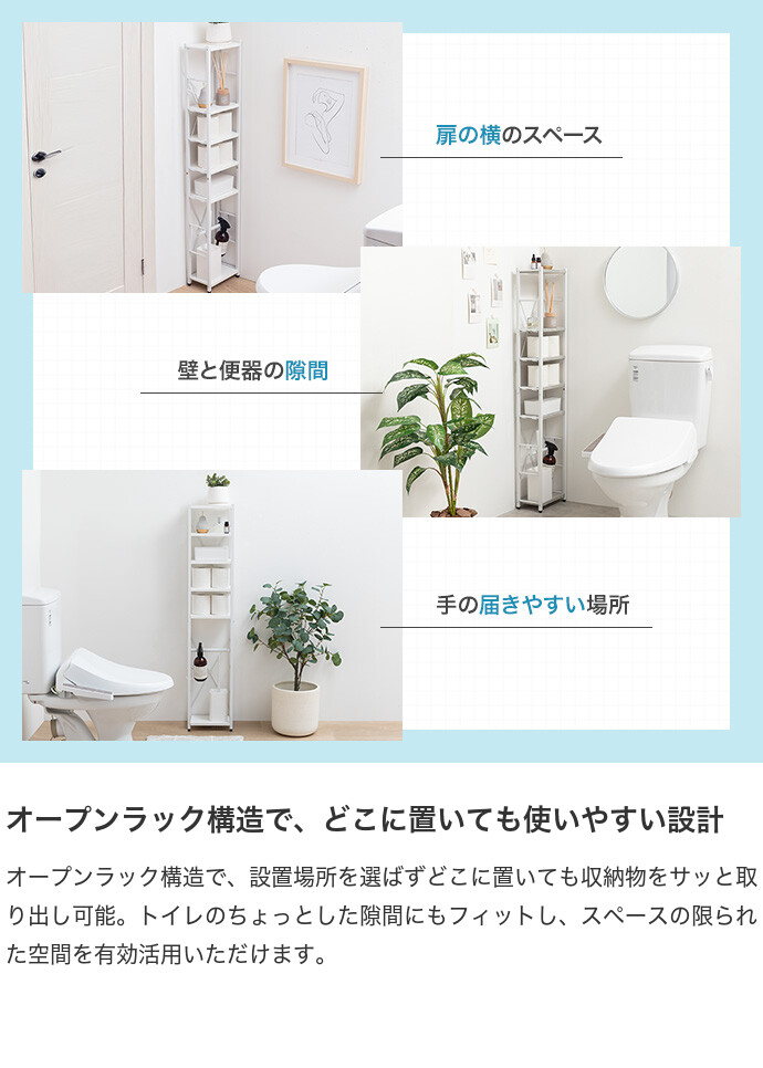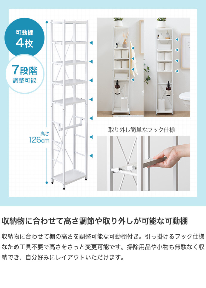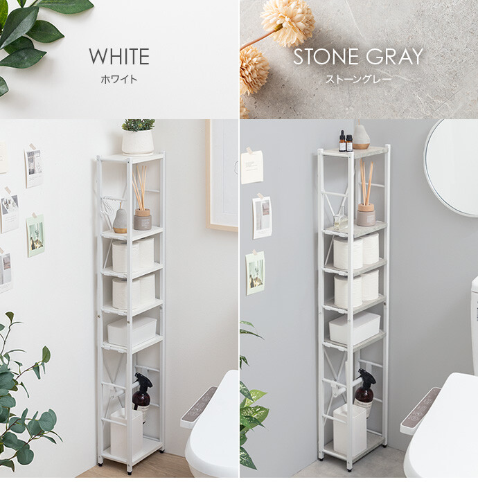 トイレ用品がひとつにまとまるスリムトイレラック。ハイタイプ&可動棚4段と吊り下げポールで、かさばるアイテムもまとめて収納。オープンタイプで圧迫感も少なく、収納物の出し入れも楽々。デッドスペースを有効活用しながら、スッキリ快適な空間を叶えます。