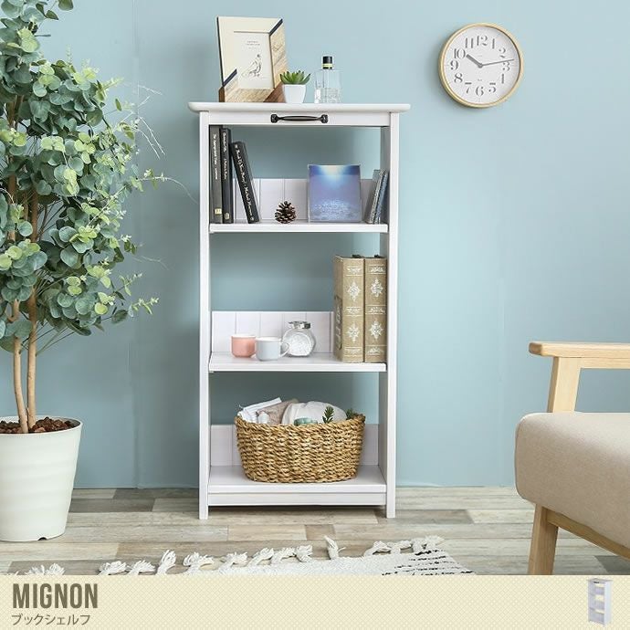 ホワイトカラーが可愛い『Mignon』ブックシェルフ。天然木ラバーウッドを使用し、上品な仕上がりです。可動棚式だから、自分好みの高さに調節可能。14段階で調節いただけます。小物類から雑誌などの大きいものまで、たくさん収納できますよ。オープンタイプなので、ディスプレイ風に飾ることもできます。お気に入りのキャンドルや写真など、コーディネートをお楽しみください。また、幅50cmとコンパクト設計ですので、1人暮らしやワンルームにお住まいの方におすすめです。