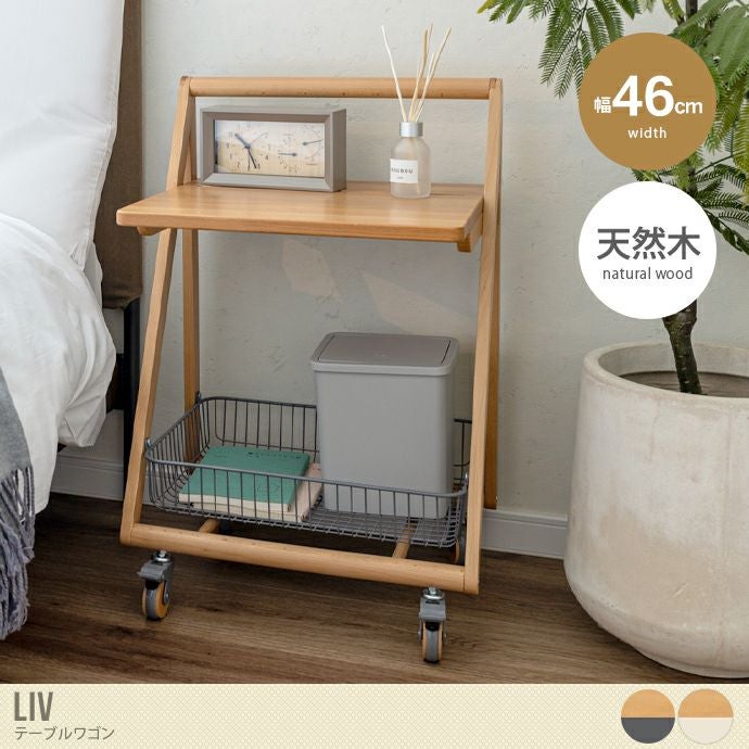 天然木の風合いを楽しめる『Liv(リヴ)』テーブルワゴン。天板はパソコン作業や書き物もできる広々設計に。表面には溝が設けられており、タブレットなどを立てて動画や映画鑑賞もお楽しみいただけます。またワゴンの下部には、スチール製のワイヤーバスケットを設置。雑誌や小物類など、ライフスタイルに合わせて様々なものをたっぷり収納可能です。木目が美しいシンプルデザインはベッドサイドやソファサイド、デスクとしても使用でき、様々なシーンで活躍します。