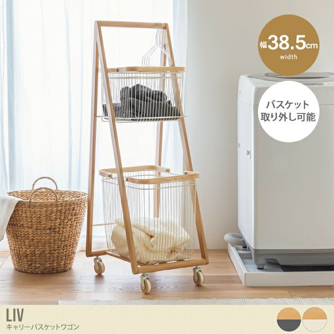 天然木の風合いを楽しめる『Liv(リヴ)』キャリーバスケットワゴン。幅38.5cmと省スペースで置けるコンパクト設計。狭い空間にも圧迫感なく置くことができ、脱衣所はもちろん、リビングや玄関など様々な場所で活躍します。また大きさが異なる2つのバスケットは、便利な取っ手付きで取り外しもできるため、お好きな場所に持ち運び可能です。