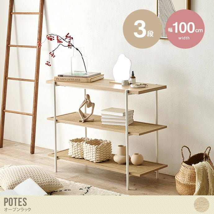 ラタン調のおしゃれなオープンラック『Potes(ポテス)』。シリーズで並べれば統一感ある空間に。ナチュラルなカラーで韓国風インテリアにも馴染みやすいデザインです。また、アクセントとなるラタン調の棚板がこなれ感を演出してくれる為、お部屋を一気にお洒落にしてくれます。脚底にはがたつき防止のアジャスターがついているので安定感にも優れています。