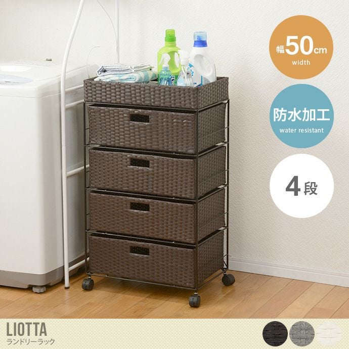 隙間収納ですっきりと使いやすい『Liotta(リオッタ)』シリーズから、幅50.5cmのランドリーラックが登場しました。便利な天板と引き出しが4杯ついているので、ドライヤーや洗剤など使用頻度の高いものは天板へ収納してサッと取り出すことができます。ラタン調の編み込みデザインは通気性だけでなく、防水加工を施しているので、濡れても拭くだけで簡単にお手入れができます。キャスター付きなので移動も楽々。コンパクトなサイズ感で、ワンルームでも圧迫感なくお使いいただけます。