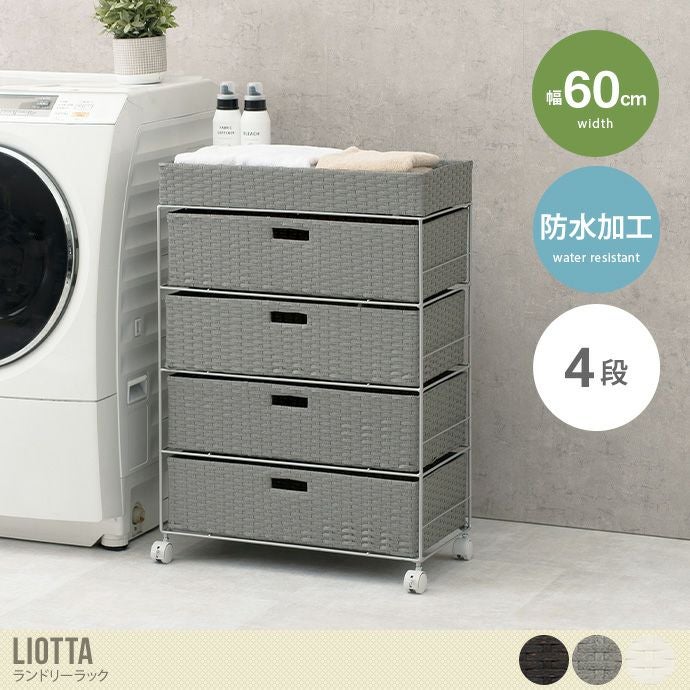 隙間収納ですっきりと使いやすい『Liotta(リオッタ)』シリーズから、幅60.5cmのランドリーラックが登場しました。便利な天板と引き出しが4杯ついているので、ドライヤーや洗剤など使用頻度の高いものは天板へ収納してサッと取り出すことができます。ラタン調の編み込みデザインは通気性だけでなく、防水加工を施しているので、濡れても拭くだけで簡単にお手入れができます。キャスター付きなので移動も楽々。コンパクトなサイズ感で、ワンルームでも圧迫感なくお使いいただけます。