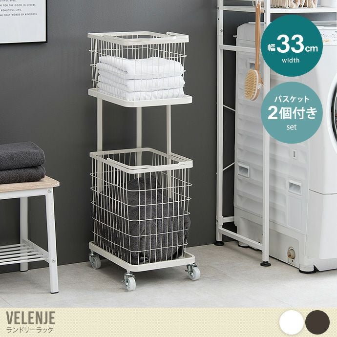 幅33 ラック ランドリー ワゴン バスケット 収納 洗濯物 カゴ2個付き 2段 スリム 省スペース キャスター 洗面所 サニタリー 脱衣所 衣類 角型 持ち運び スタッキング 取り外し可能 分別 ストック入れ 粉体塗装 ホワイト