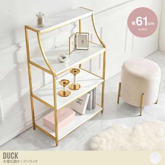 大理石調の天板とゴールドフレームが高級感を醸し出す『Duck(ダック)』オープンラック。華やかで上品なエレガントデザインは、お部屋に置くだけで洗練された空間を演出。オープンタイプで飾ったものが見やすく、手に取りやすいため、お気に入りの雑誌や小物類などをディスプレイしていただけます。さらに脚部にはアジャスターは付いているため、ガタつきにくく安心して使用可能です。