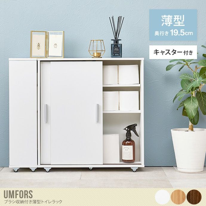 引き戸タイプで省スペースに収納できる『Umfors(ウムフォシュ)』ブラシ収納付き薄型トイレラック。奥行19.5cmとスリムながらも、トイレットペーパーを最大20個収納できる大容量収納を実現しました。また足元にはキャスターがついており、移動が簡単に行えるため、日々のお掃除を快適にします。さらにサイドにはトイレブラシ専用の収納スペース付きで、ペーパー類と分けて収納できるため衛生面も安心です。