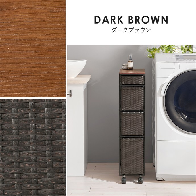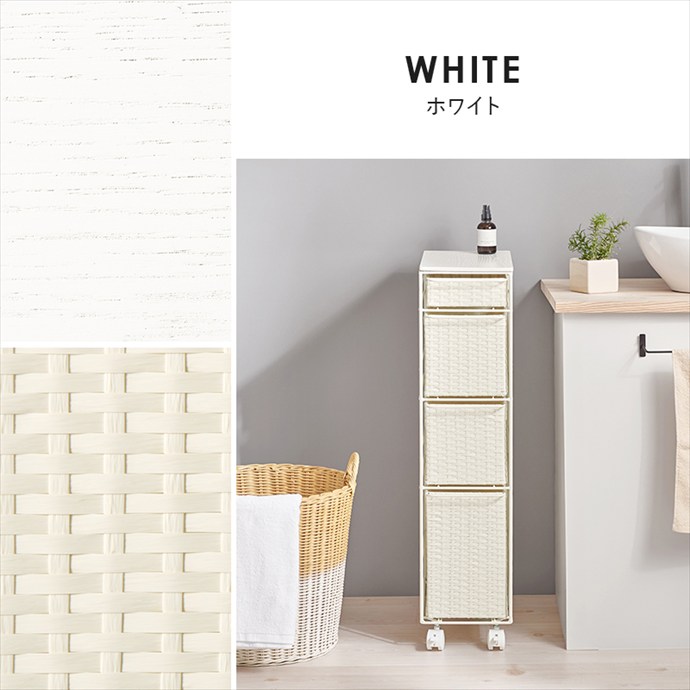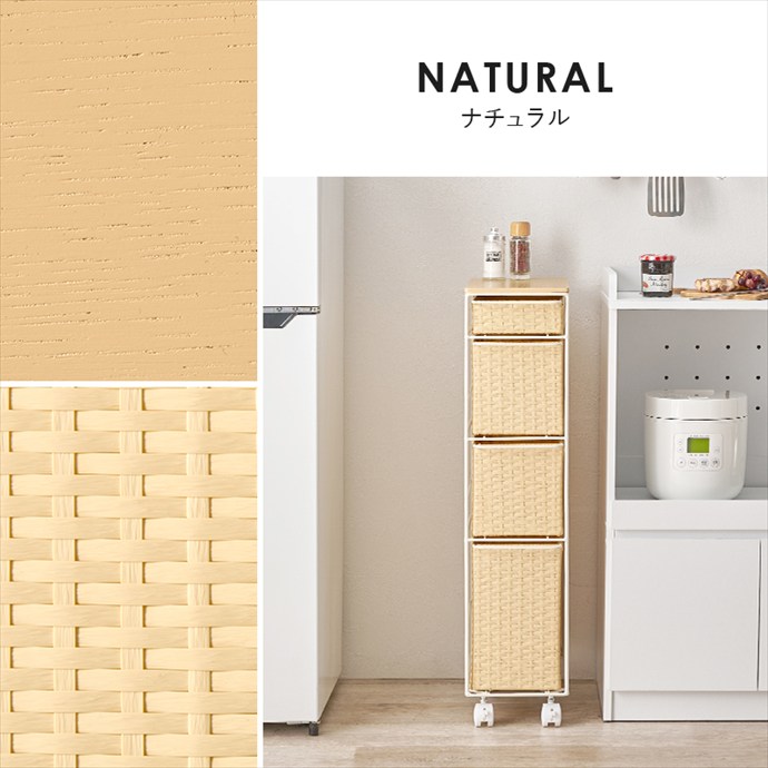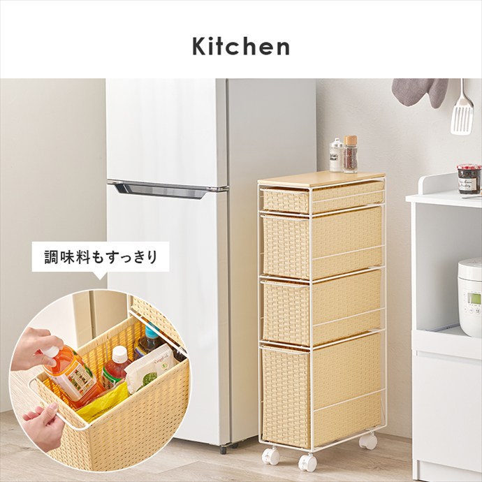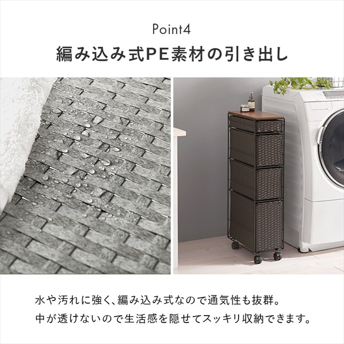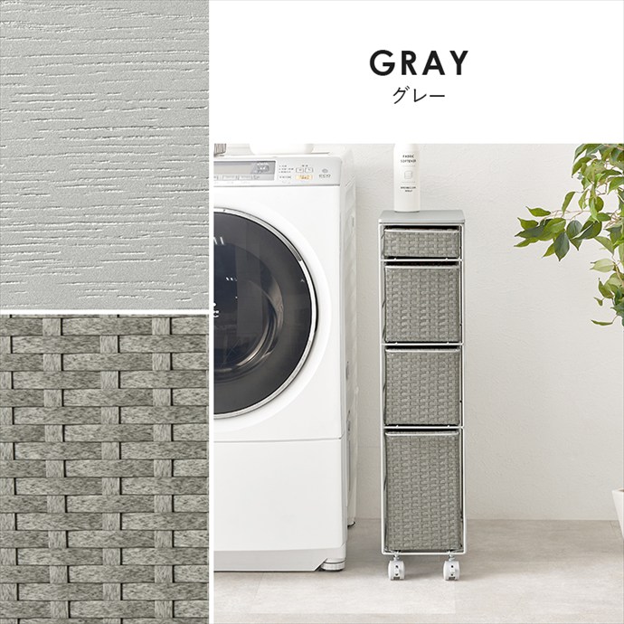 隙間にすっきり収まるスリムなランドリーチェスト。ラタン調に編み込まれた樹脂製の引き出しは、水や汚れに強くお手入れが簡単。通気性にも優れており、湿気の多い場所でも快適にお使いいただけます。また4杯の引き出しはそれぞれ高さが異なり、収納物に合わせて使い分けが可能です。さらにキャスター付きのため、移動や掃除もスムーズに。ランドリーだけでなくキッチンやリビング収納としても活躍します。