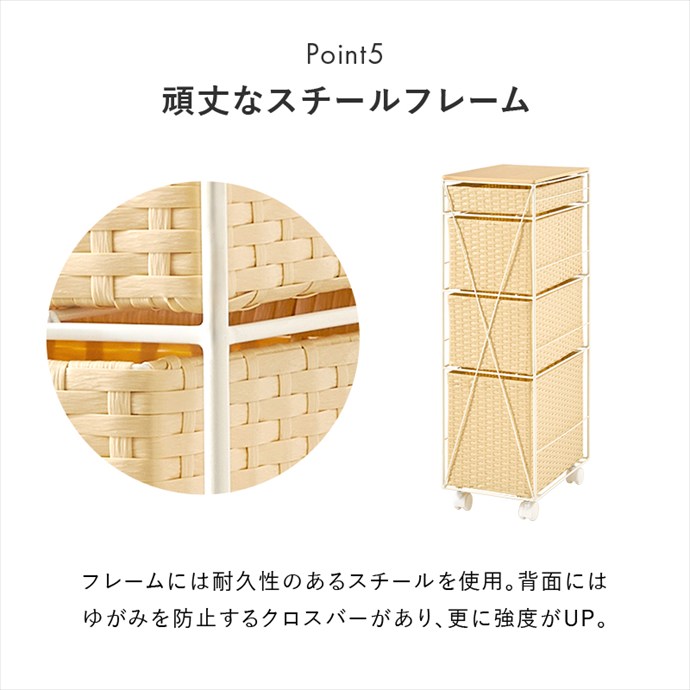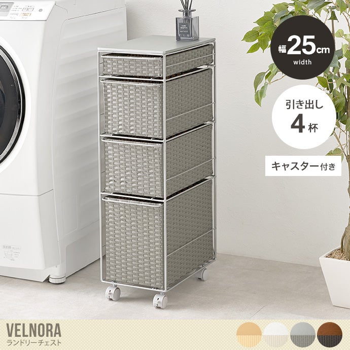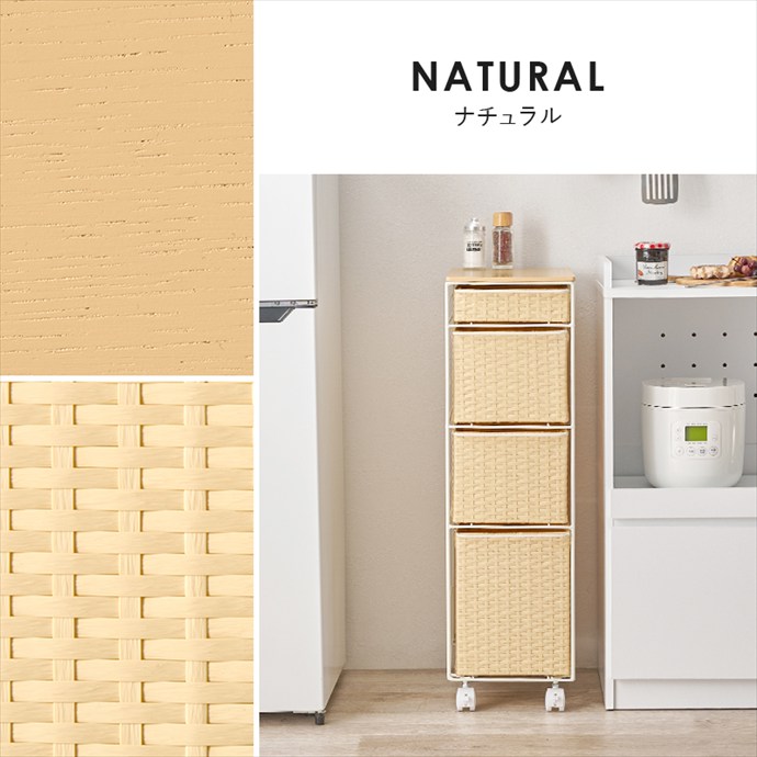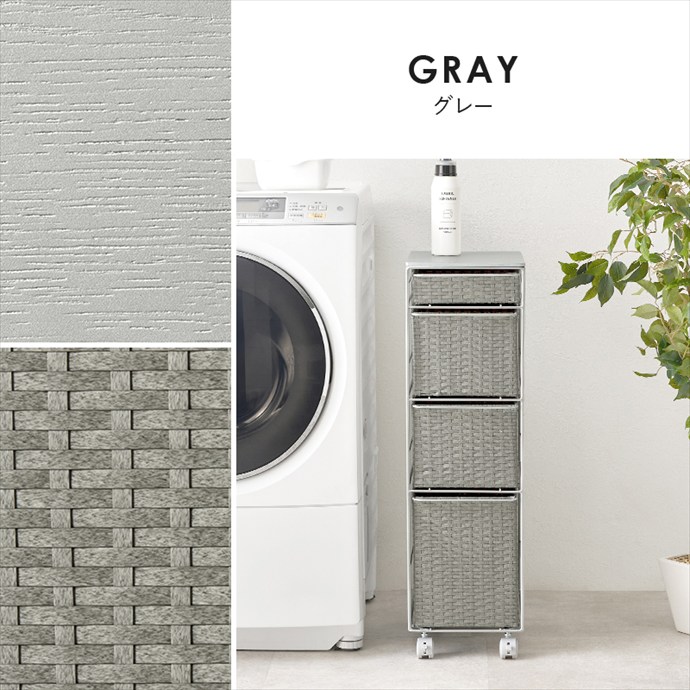 隙間にすっきり収まるスリムなランドリーチェスト。ラタン調に編み込まれた樹脂製の引き出しは、水や汚れに強くお手入れが簡単。通気性にも優れており、湿気の多い場所でも快適にお使いいただけます。また4杯の引き出しはそれぞれ高さが異なり、収納物に合わせて使い分けが可能です。さらにキャスター付きのため、移動や掃除もスムーズに。ランドリーだけでなくキッチンやリビング収納としても活躍します。