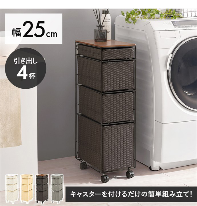 【送料無料】幅25 ランドリーチェスト 隙間収納 ラック ワゴン バスケット 洗面所 脱衣所 おしゃれ おすすめ 安い すきま収納 コンパクト スリム 引き出し 4杯 通気性 キャスター付き キッチン 一人暮らし ワンルーム タオル 衣類 ナチュラル