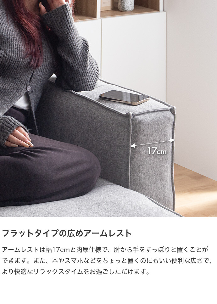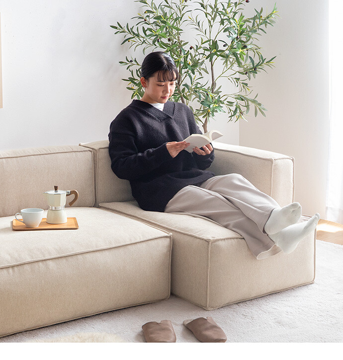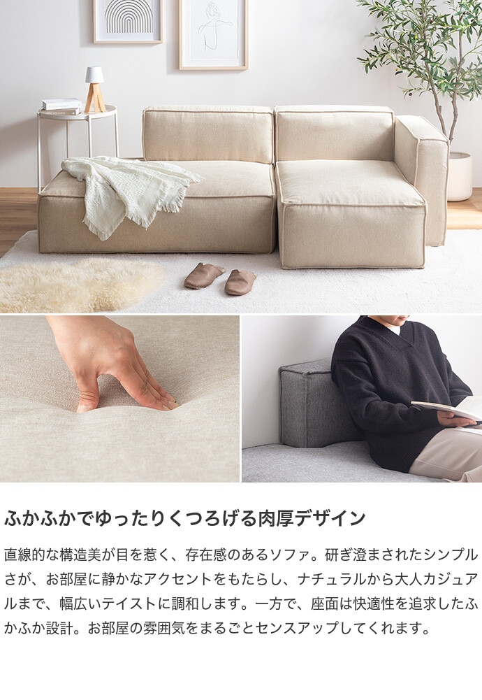 足を伸ばしてゆったりくつろげるローソファー。直線的な構造美が目を惹く、存在感抜群のソファです。研ぎ澄まされたシンプルさが、お部屋に静かなアクセントをもたらし、ナチュラルから大人カジュアルまで、幅広いテイストに調和します。さらに、広々座面とふかふかな座り心地で、のびのびとした快適さを実現。また、座面高を低く抑えた低重心設計で、お部屋を落ち着いた大人の空間に導きます。セットでのご利用はもちろん、単品での使い方もお楽しみいただけます。