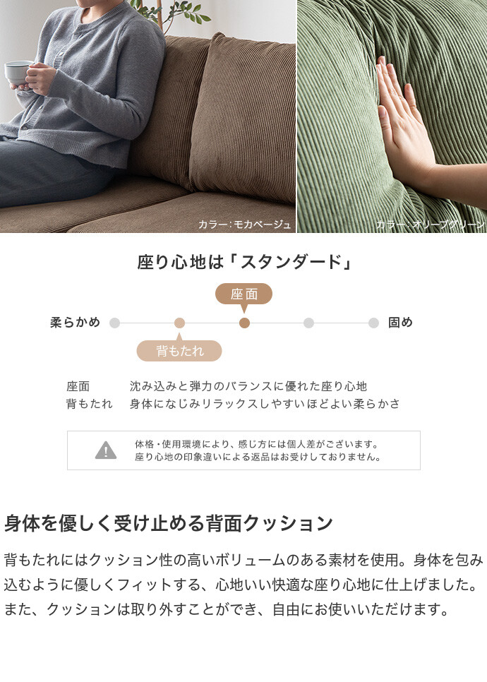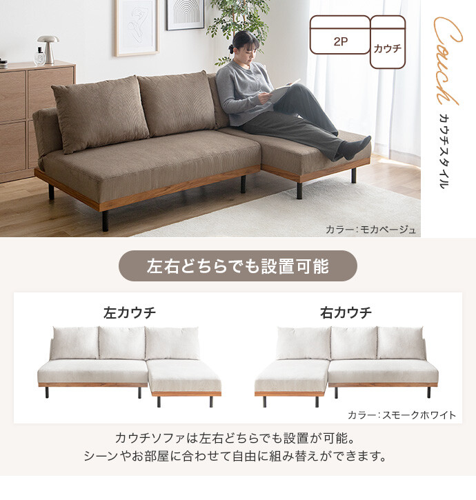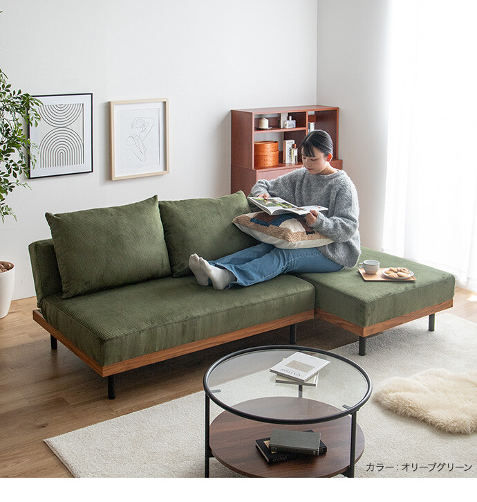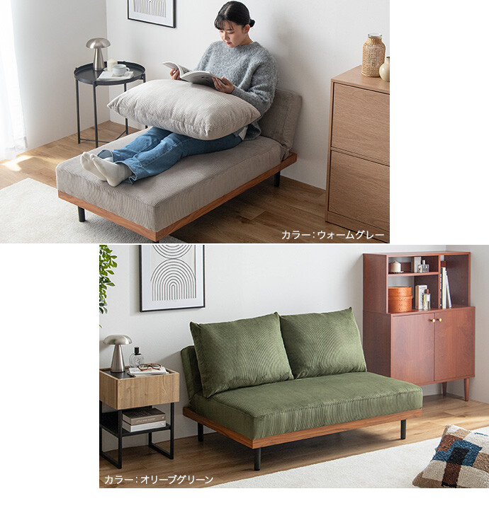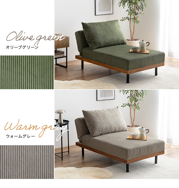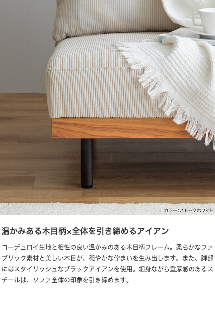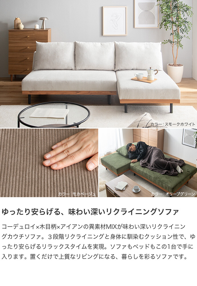 コーデュロイ×木目柄×アイアンの異素材MIXが味わい深いリクライニングソファ。コーデュロイの優しい肌触りと心地よい弾力のクッション、楽な姿勢に調整できる3段階リクライニングで、快適なくつろぎタイムを叶えます。あぐらもかける広々座面ながら、脚も取り外せるロー設計なので圧迫感が少なく、ワンルームなどのスペースに余裕のないお部屋にもピッタリ。また、2脚揃えるとソファベッドになり、友人や家族が泊まりに来た時用の簡易ベッドや、足をのばしてくつろぐゆったりソファとしても大活躍します。