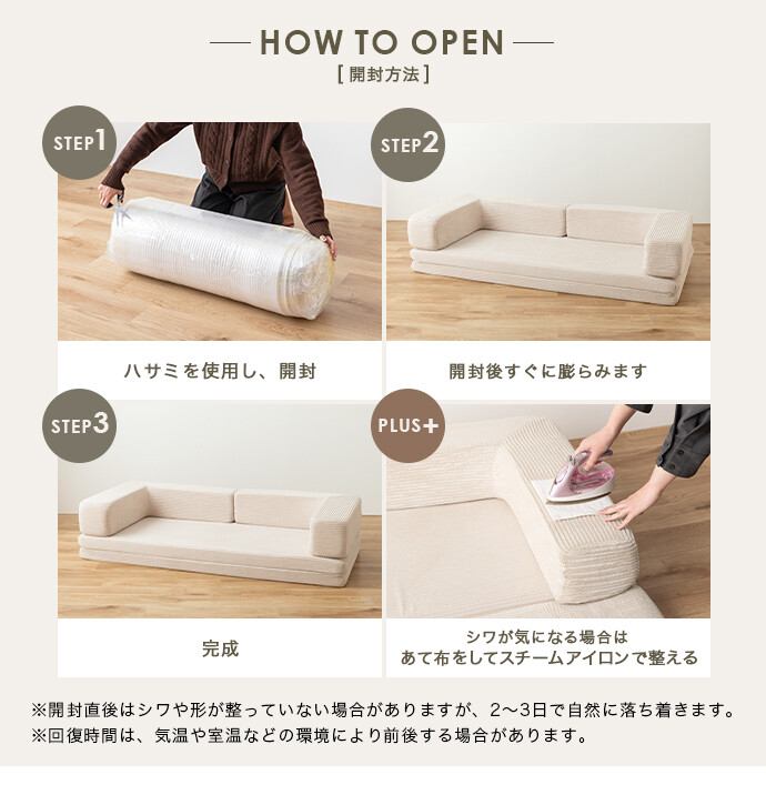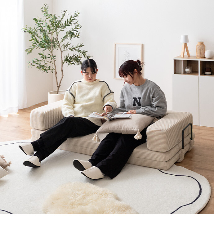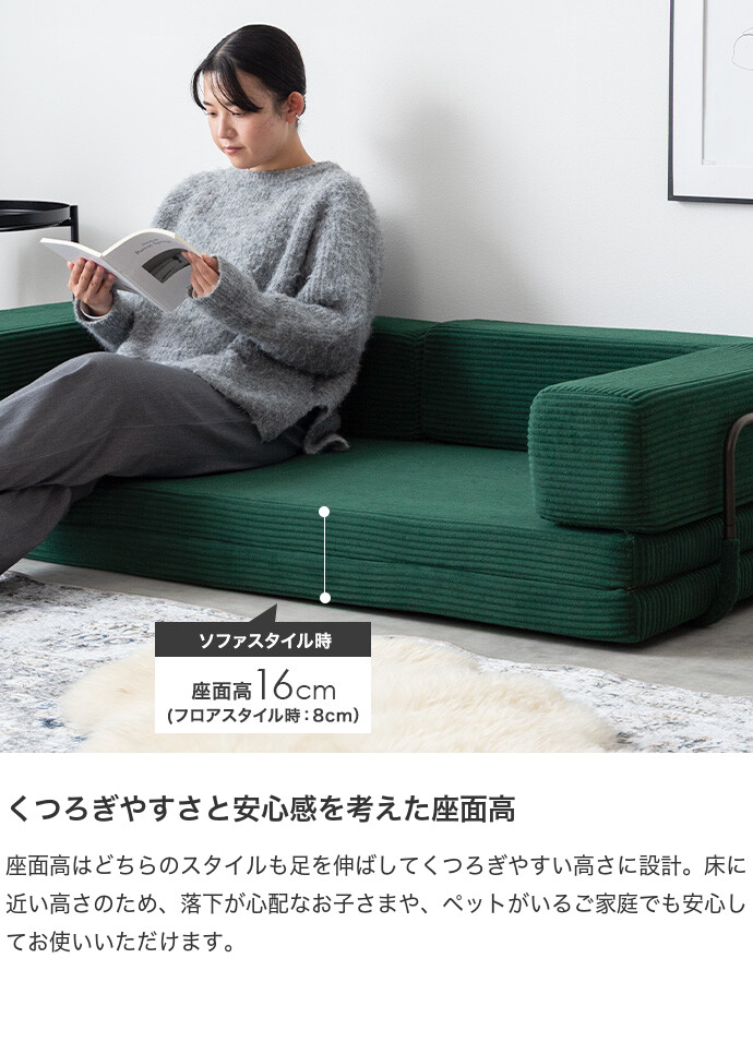 座面を広げてくつろぎ、折りたたんで腰掛ける、気分や用途に合わせて気軽に使い分けられるフロアソファ。座面高は床に近い低めの設計のため、足を伸ばしてくつろぎやすく、小さなお子さまやペットがいるご家庭でも安心です。さらに圧縮梱包で届くため、狭い玄関や通路でも搬入がラクに行えます。
