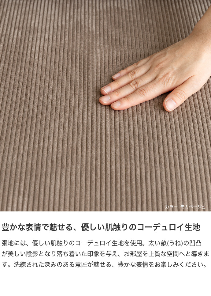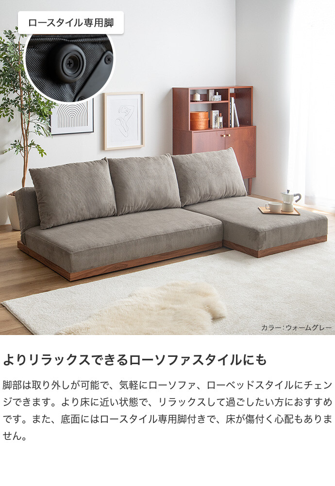 コーデュロイ×木目柄×アイアンの異素材MIXが味わい深いリクライニングソファ。コーデュロイの優しい肌触りと心地よい弾力のクッション、楽な姿勢に調整できる3段階リクライニングで、快適なくつろぎタイムを叶えます。あぐらもかける広々座面ながら、脚も取り外せるロー設計なので圧迫感が少なく、ワンルームなどのスペースに余裕のないお部屋にもピッタリ。また、2脚揃えるとソファベッドになり、友人や家族が泊まりに来た時用の簡易ベッドや、足をのばしてくつろぐゆったりソファとしても大活躍します。