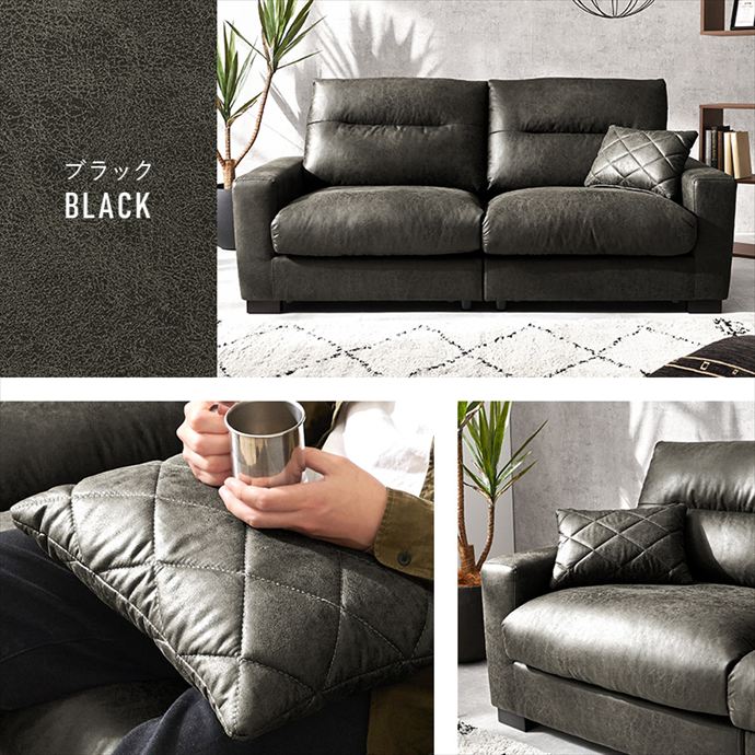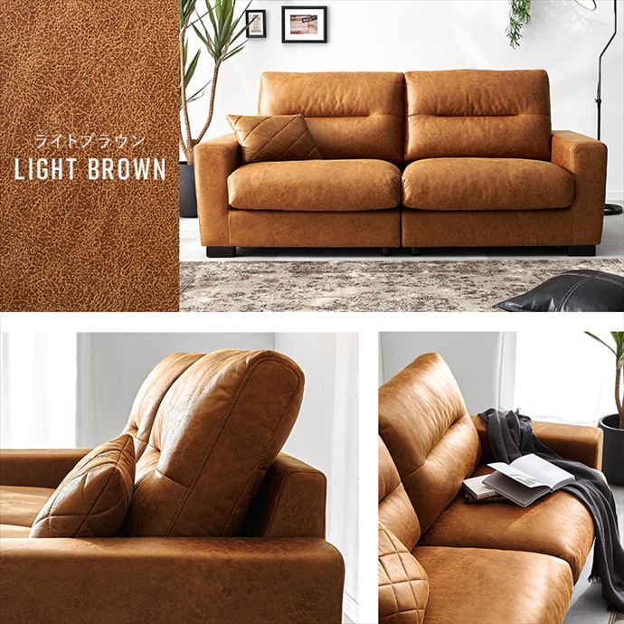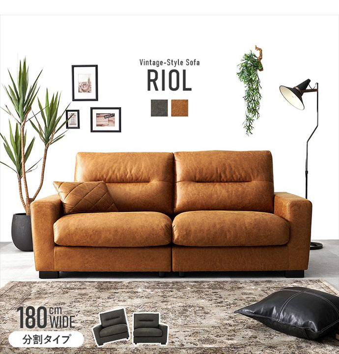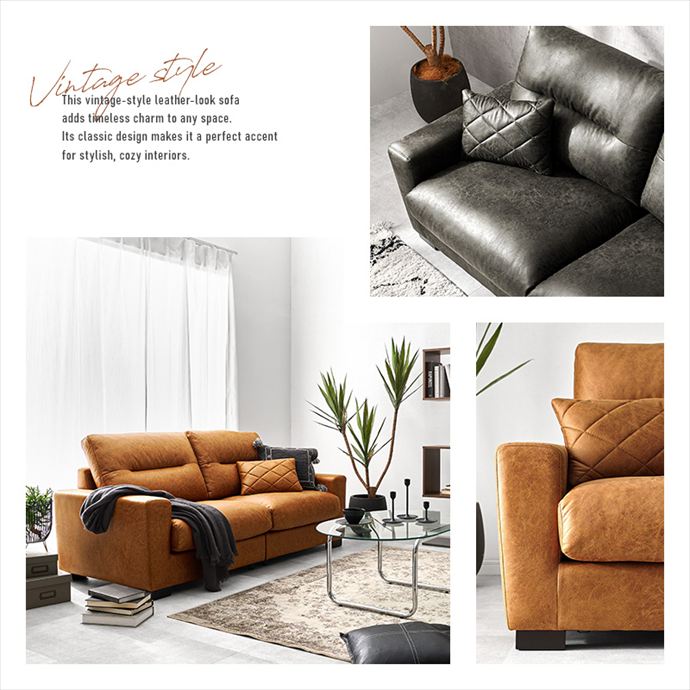 ヴィンテージな風合いを醸し出す、幅180cmのワイドな3人掛けソファ。リアルな質感を追求したレザー調の張地は、本革のような重厚感がありながら、冬のひんやり感や夏のベタつきを抑えた快適な素材を採用しました。内部にはウレタンと綿を贅沢に使用し、ボリュームのあるシルエットと確かな座り心地を実現。お部屋の主役となる高いデザイン性と、日常の使いやすさを兼ね備えたこだわりの一品です。