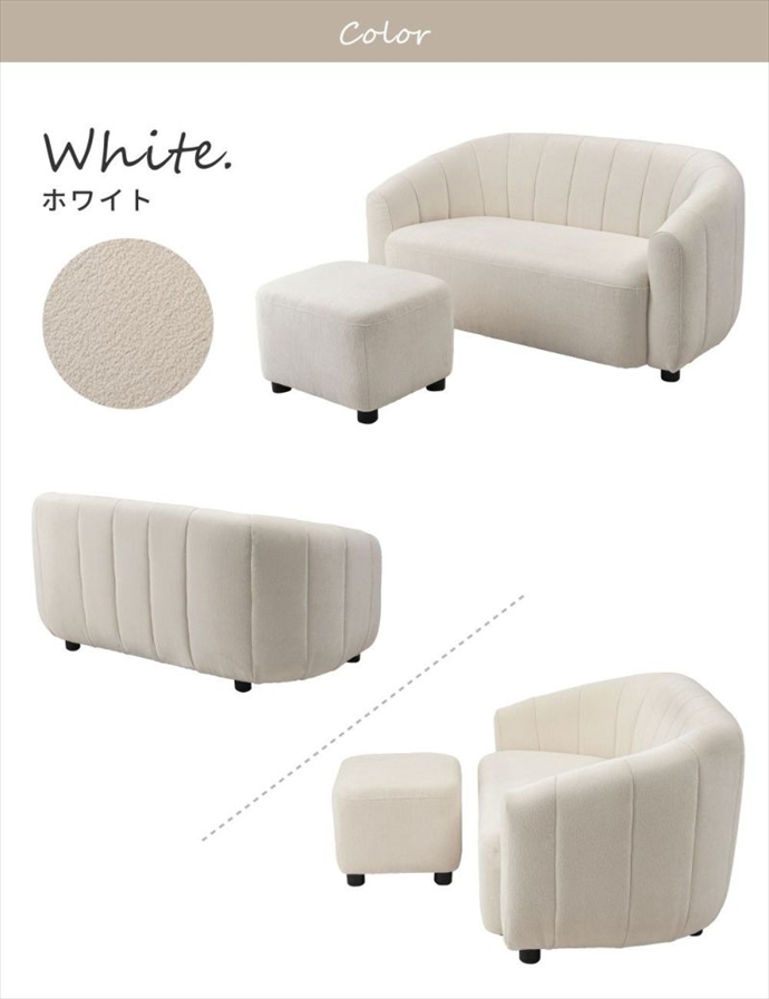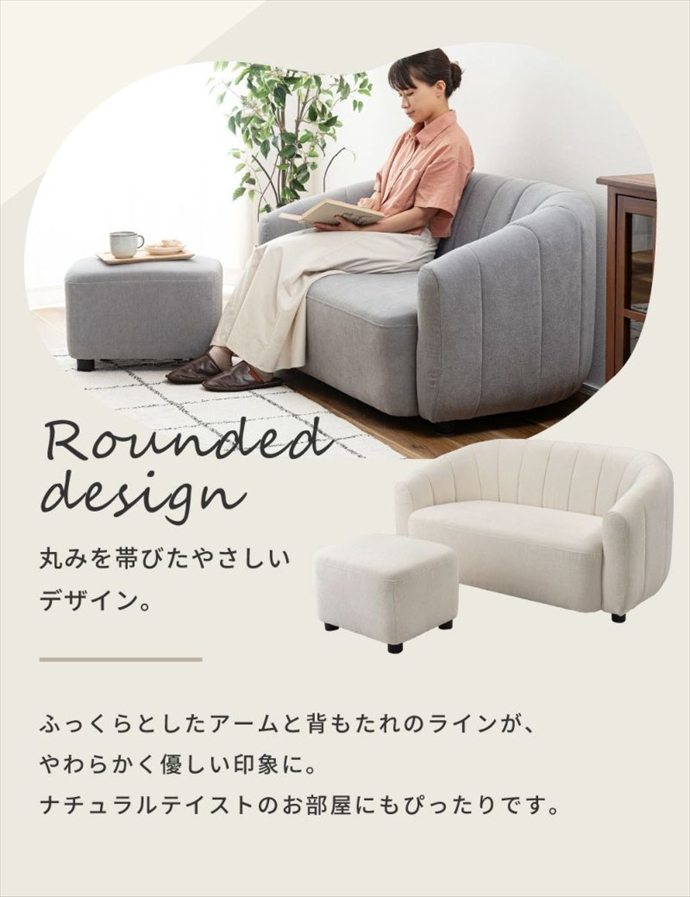 丸みを帯びた可愛らしいデザインが特徴のオットマン付き2人掛けソファ。ふっくらとしたアームと背もたれの柔らかなラインが優しい印象を与え、お部屋に温かみをプラス。また座面は硬すぎず柔らかすぎない、長時間座っても快適に過ごせる絶妙な座り心地に仕上げました。オットマンを合わせることで、足を伸ばしてゆったりと座ることができ、自分だけのくつろぎ時間をよりリラックスしてお過ごしいただけます。