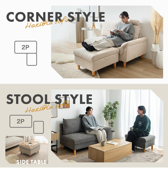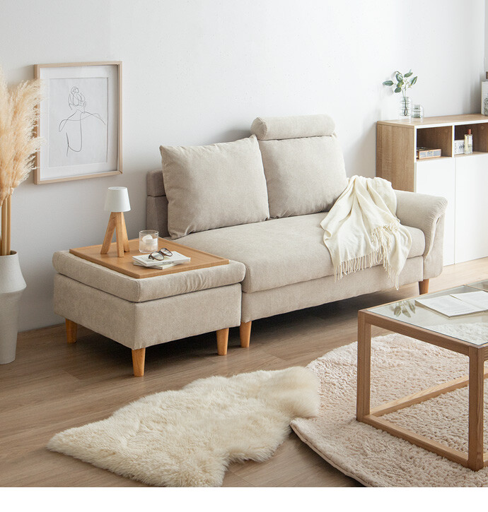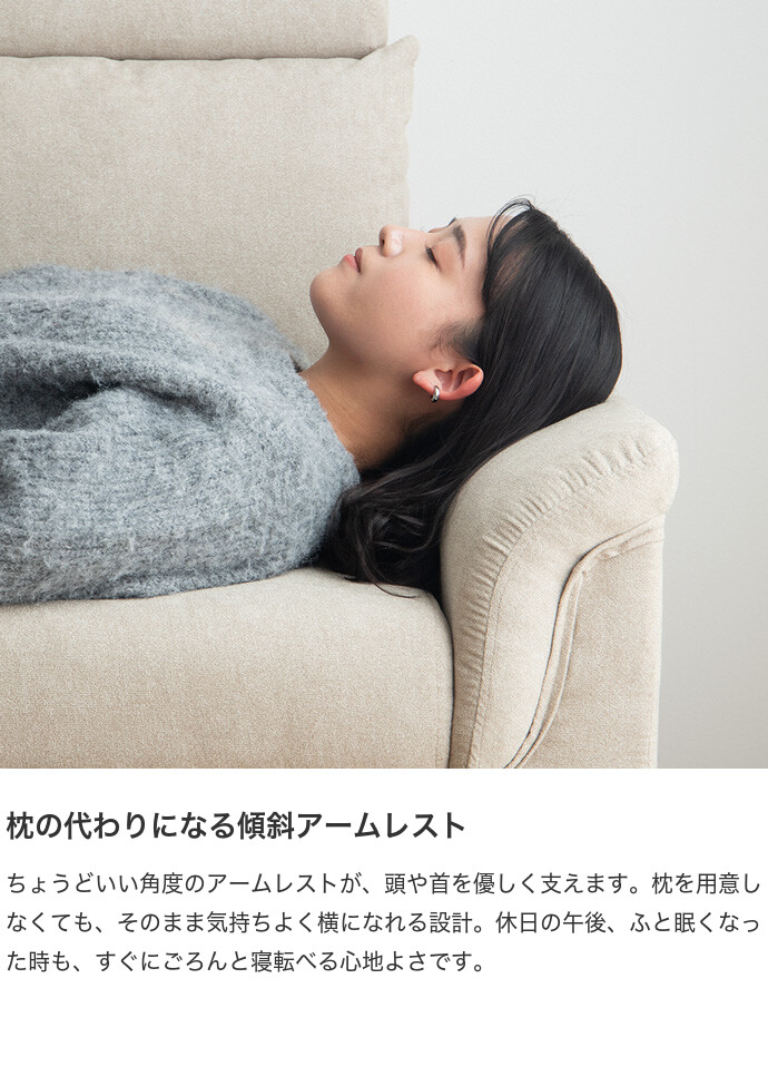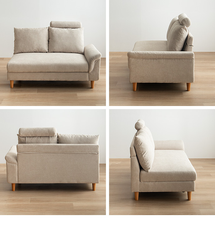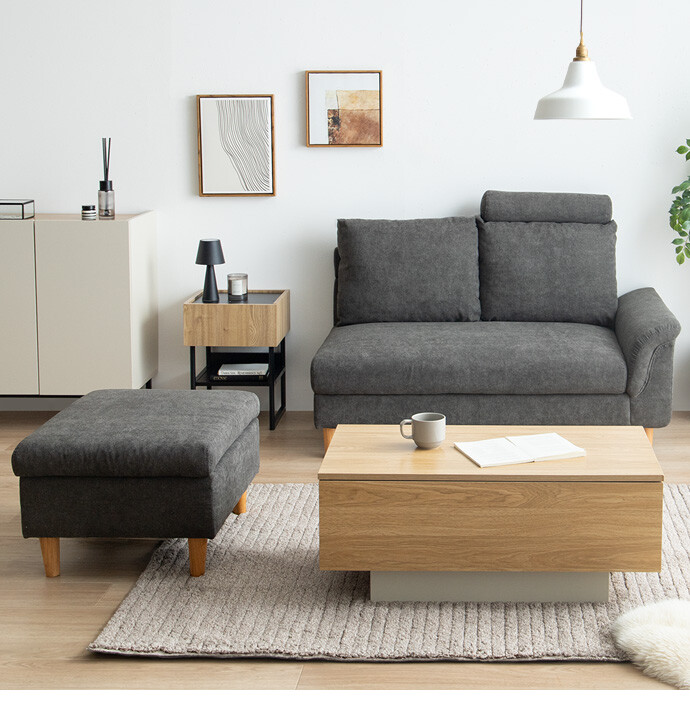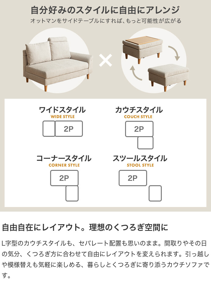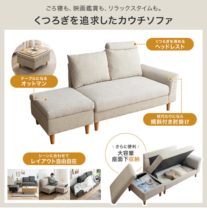 ごろ寝も収納も叶える、多機能カウチソファ。広々とした座面に寝転がって、傾斜のついたアームレストを枕代わりにくつろいでいただけます。またソファとオットマンはどちらも座面下に収納スペースを備え付け。空間を有効活用しながら、快適なくつろぎ時間を生み出します。