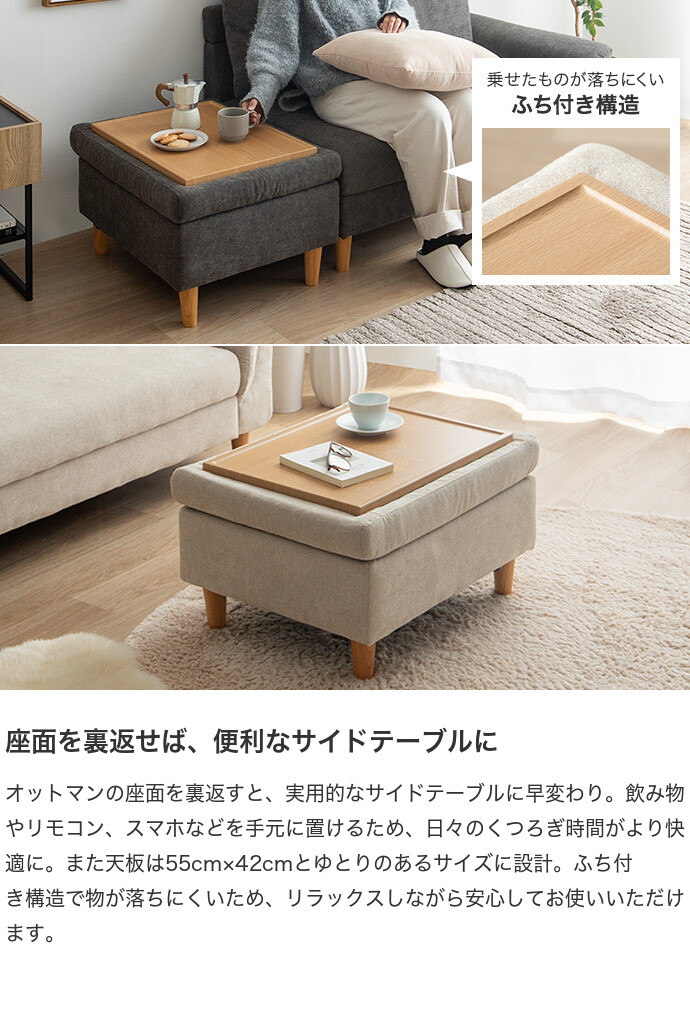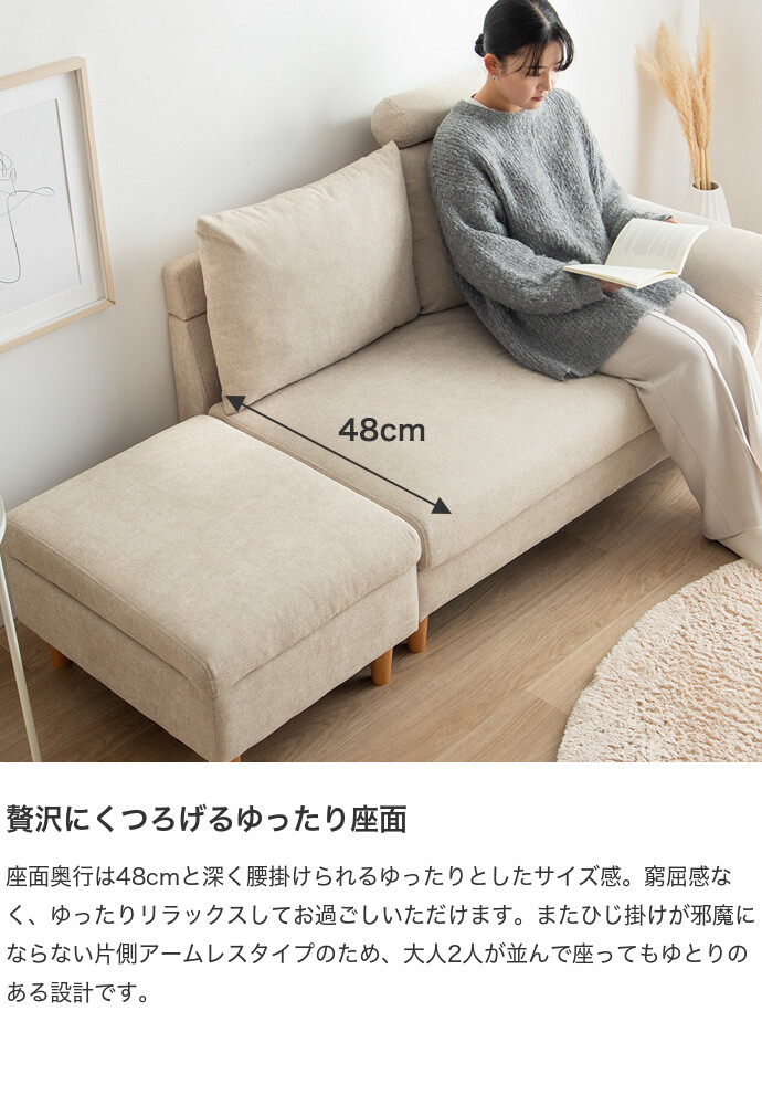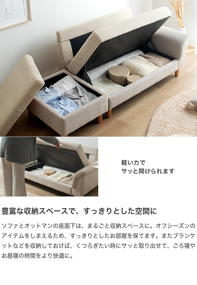 【耐荷重】ソファ:約200kg 、オットマン:約150kg、オットマン(天板):約50kg、ソファ収納スペース:約20kg、オットマン収納スペース:約20kg
