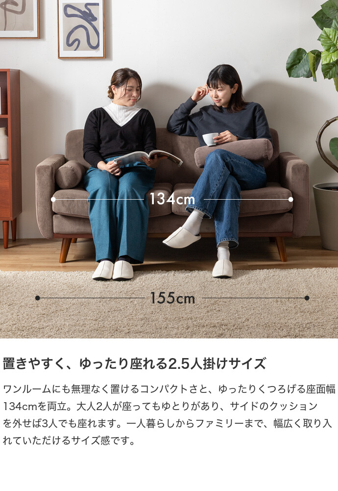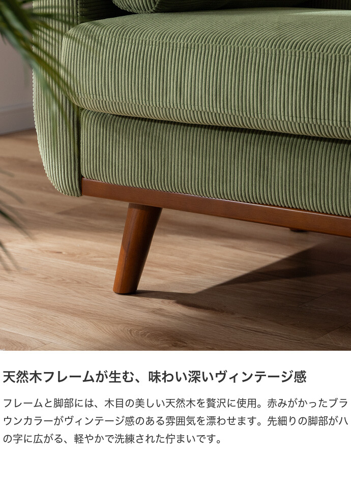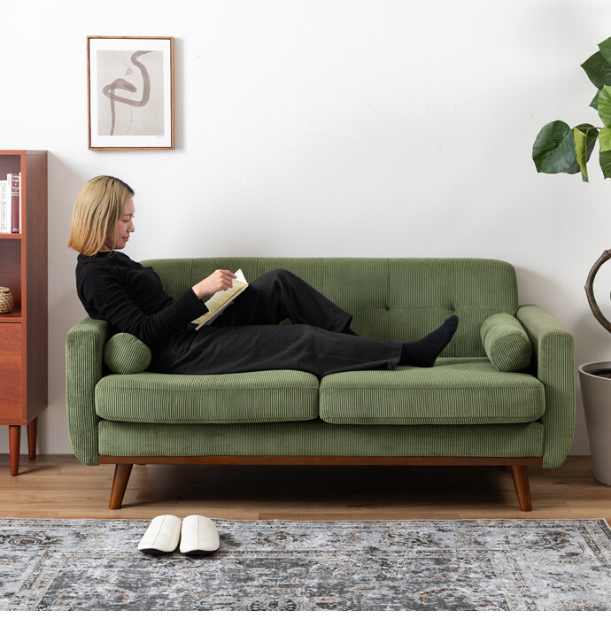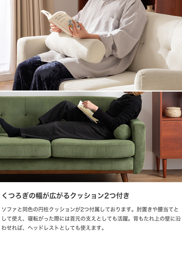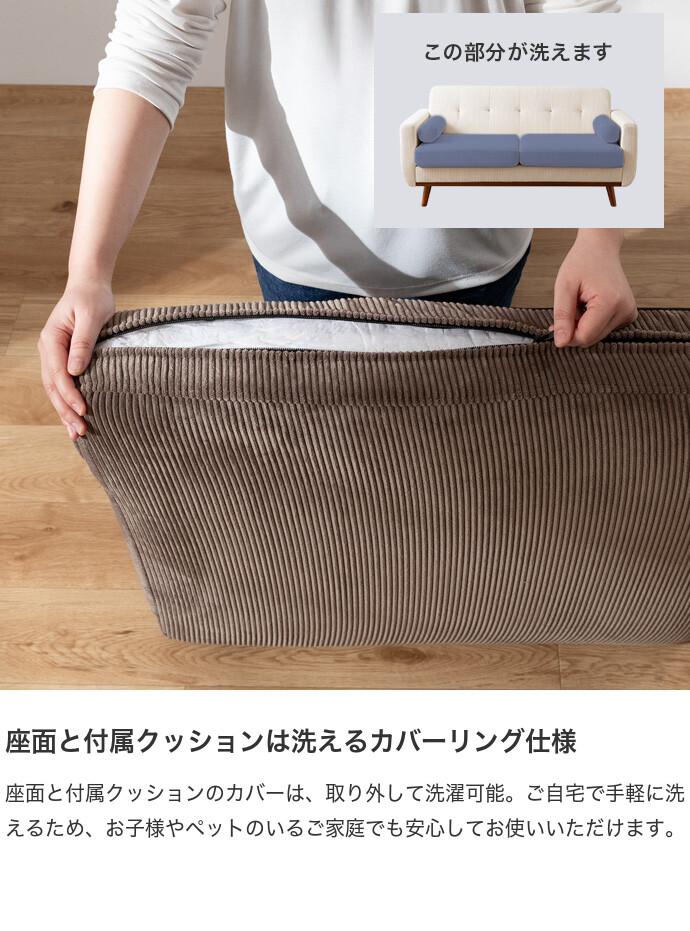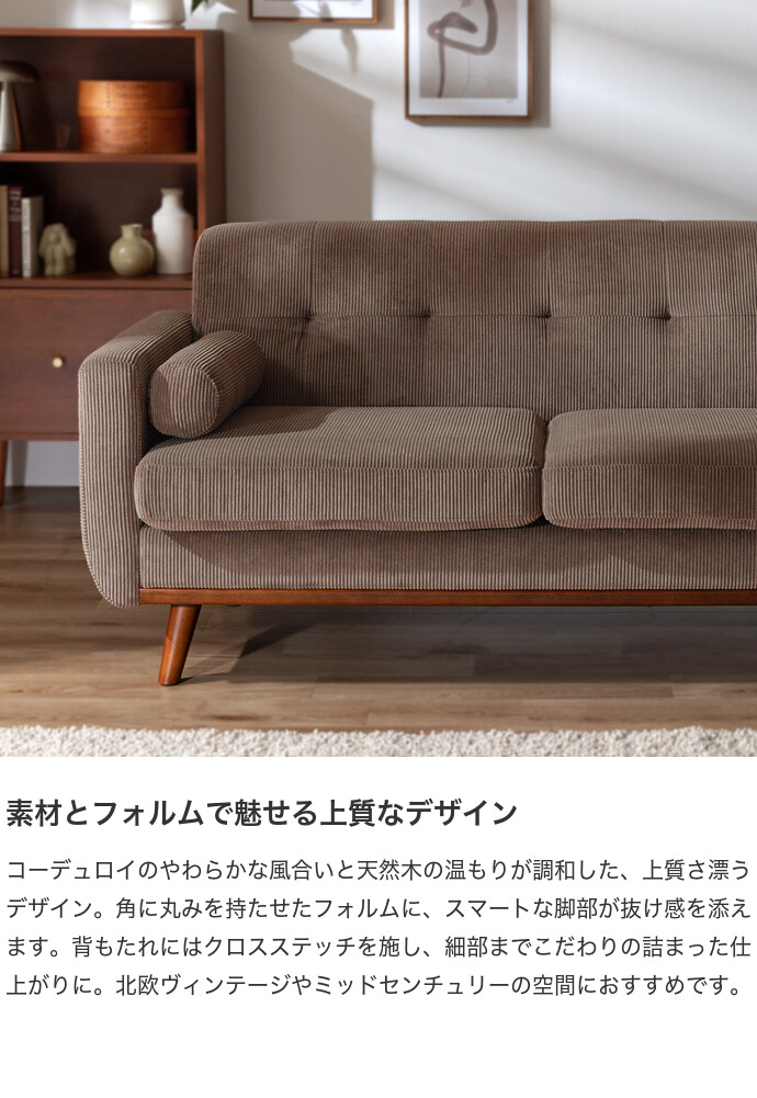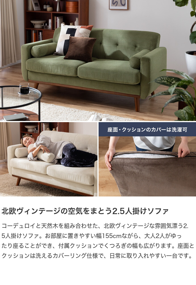 コーデュロイ生地と天然木フレームを組み合わせた、北欧ヴィンテージ風の2.5人掛けソファ。幅155cmとコンパクトながら、大人2人がゆったり座れる絶妙なサイズ感です。円柱形のクッションが2個付属しており、肘あてや枕としてくつろぎをサポートします。座面と付属クッションは、ご家庭で手軽に洗濯していただけるカバーリング仕様。美しいデザインと機能性を兼ね備えた、お部屋の主役となる一台です。