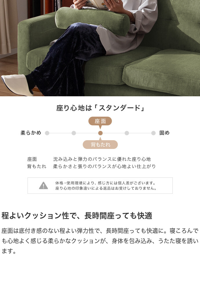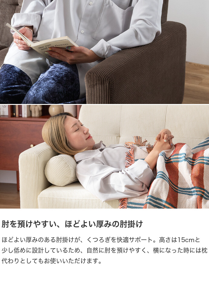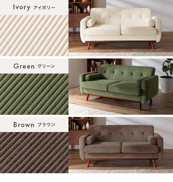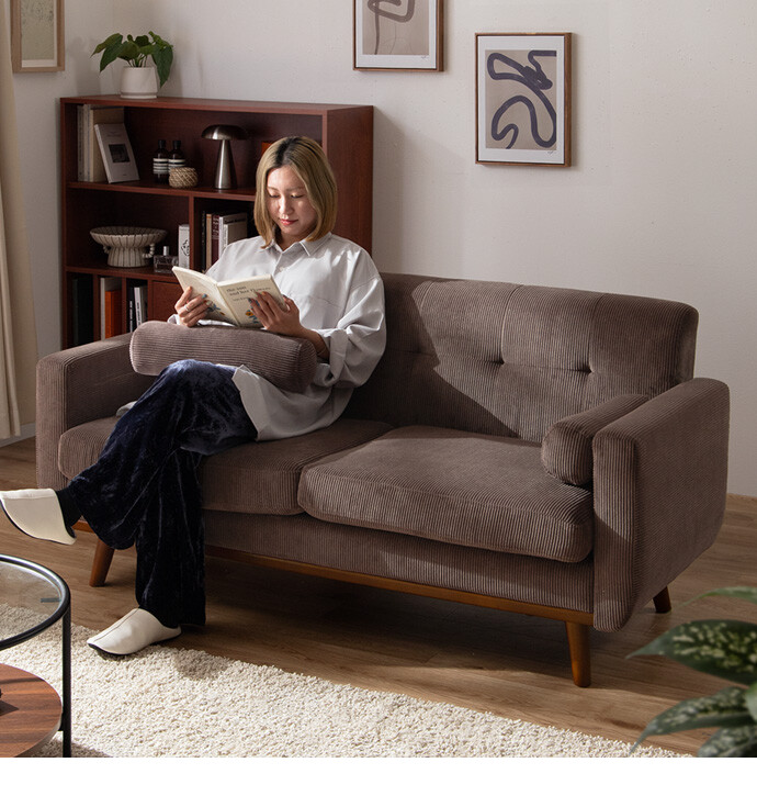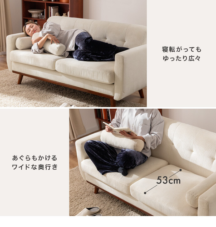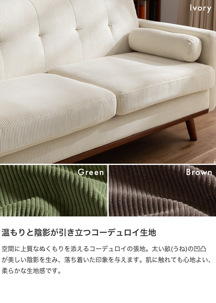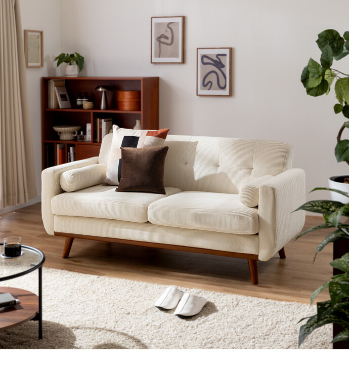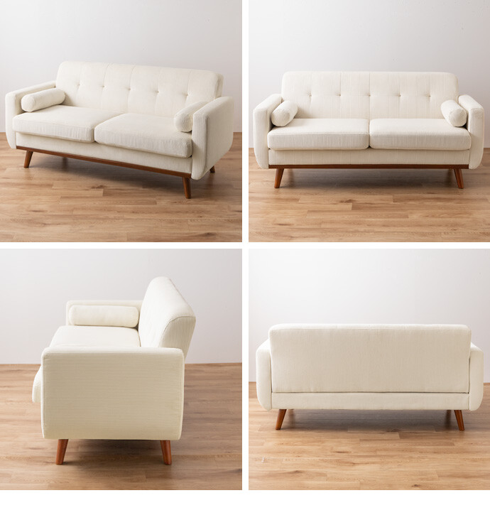 コーデュロイ生地と天然木フレームを組み合わせた、北欧ヴィンテージ風の2.5人掛けソファ。幅155cmとコンパクトながら、大人2人がゆったり座れる絶妙なサイズ感です。円柱形のクッションが2個付属しており、肘あてや枕としてくつろぎをサポートします。座面と付属クッションは、ご家庭で手軽に洗濯していただけるカバーリング仕様。美しいデザインと機能性を兼ね備えた、お部屋の主役となる一台です。