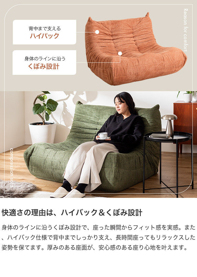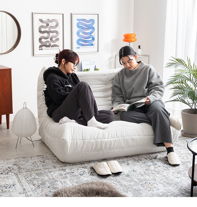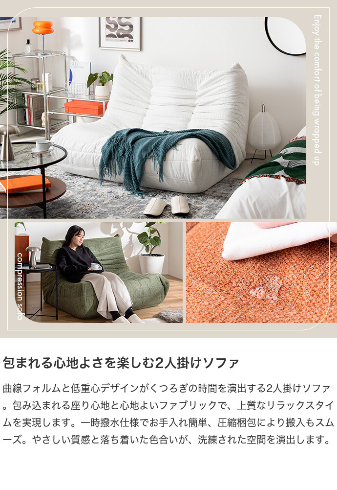 曲線フォルムと低重心デザインがくつろぎの時間を演出する2人掛けソファ。包み込まれる座り心地と心地よいファブリックで、上質なリラックスタイムを実現します。一時撥水仕様でお手入れ簡単、圧縮梱包により搬入もスムーズ。やさしい質感と落ち着いた色合いが、洗練された空間を演出します。