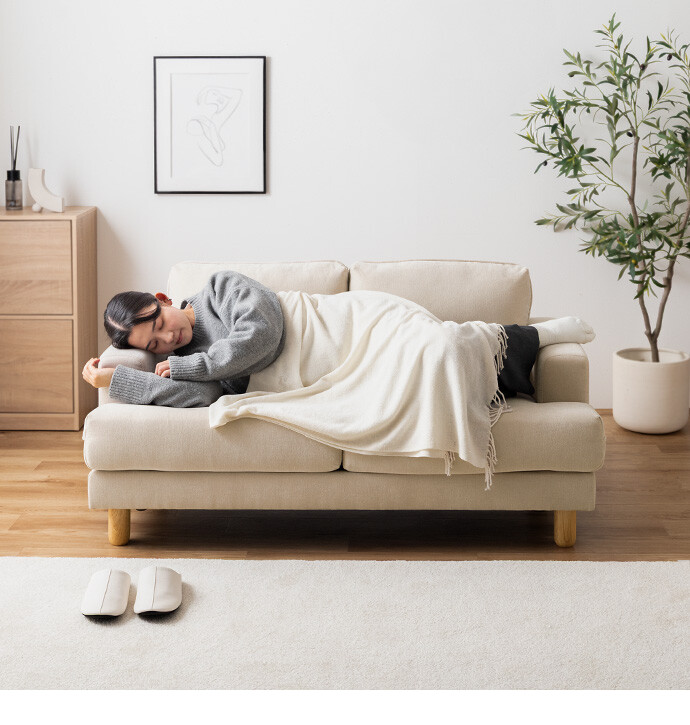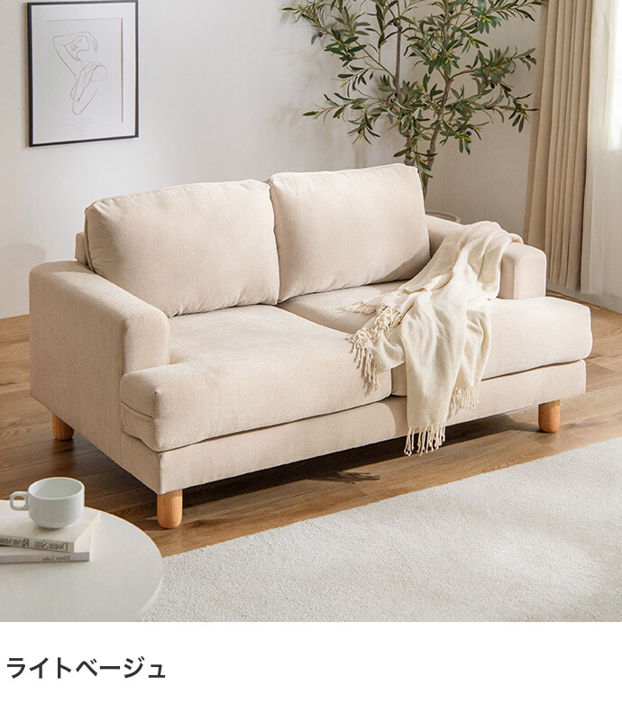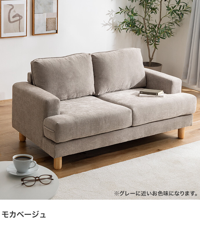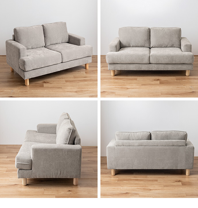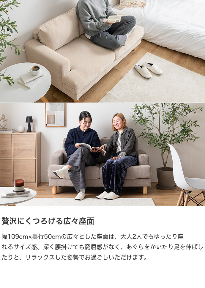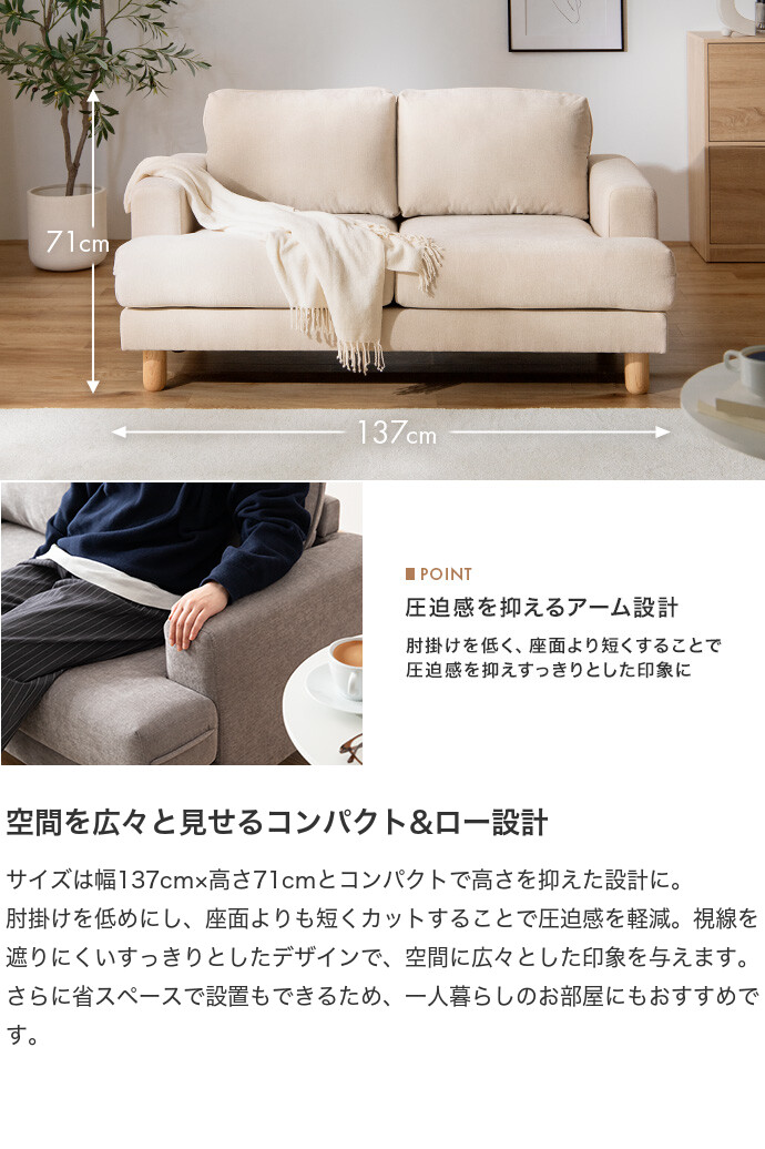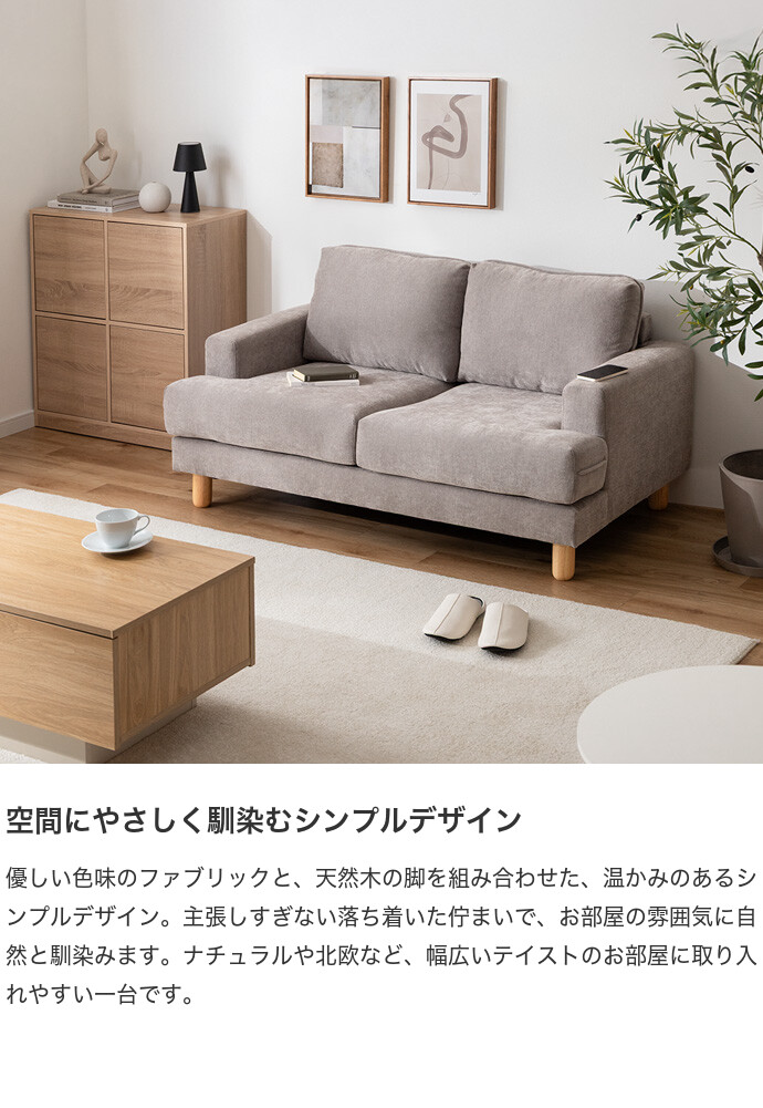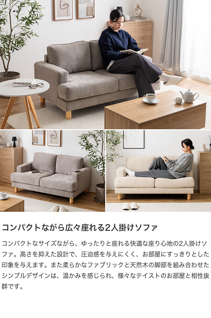 コンパクトなサイズながら、ゆったりと座れる快適な座り心地の2人掛けソファ。高さを抑えた設計で、圧迫感を与えにくく、お部屋にすっきりとした印象を与えます。また柔らかなファブリックと天然木の脚部を組み合わせたシンプルデザインは、温かみを感じられ、様々なテイストのお部屋と相性抜群です。