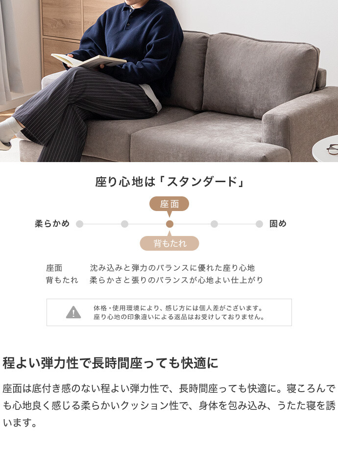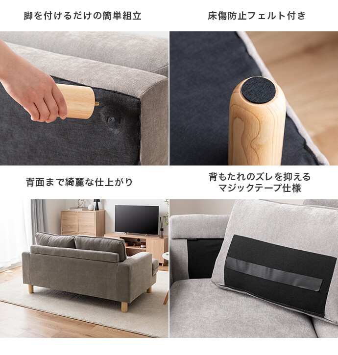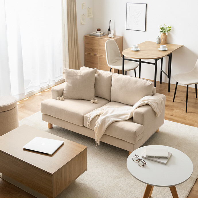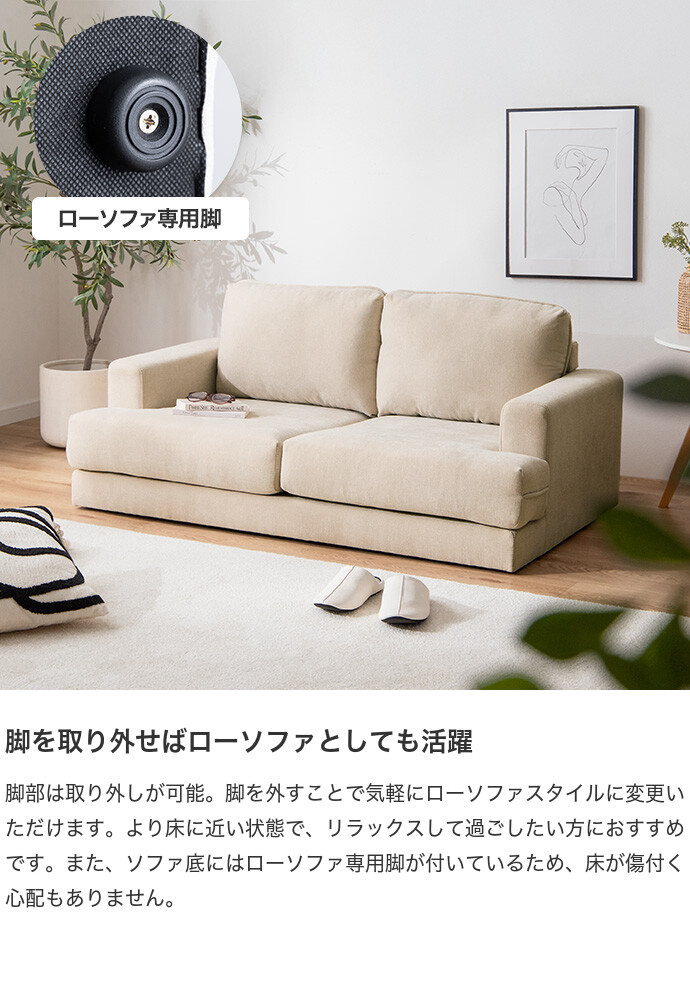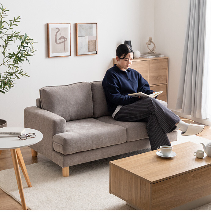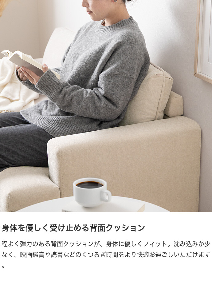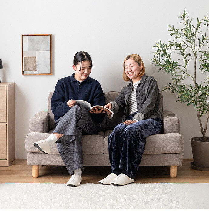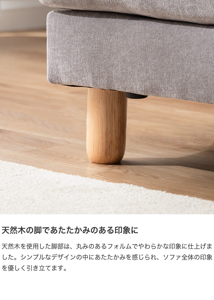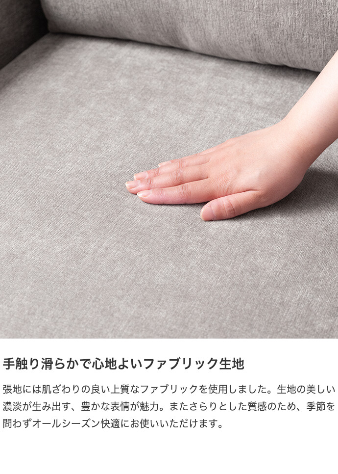コンパクトなサイズながら、ゆったりと座れる快適な座り心地の2人掛けソファ。高さを抑えた設計で、圧迫感を与えにくく、お部屋にすっきりとした印象を与えます。また柔らかなファブリックと天然木の脚部を組み合わせたシンプルデザインは、温かみを感じられ、様々なテイストのお部屋と相性抜群です。