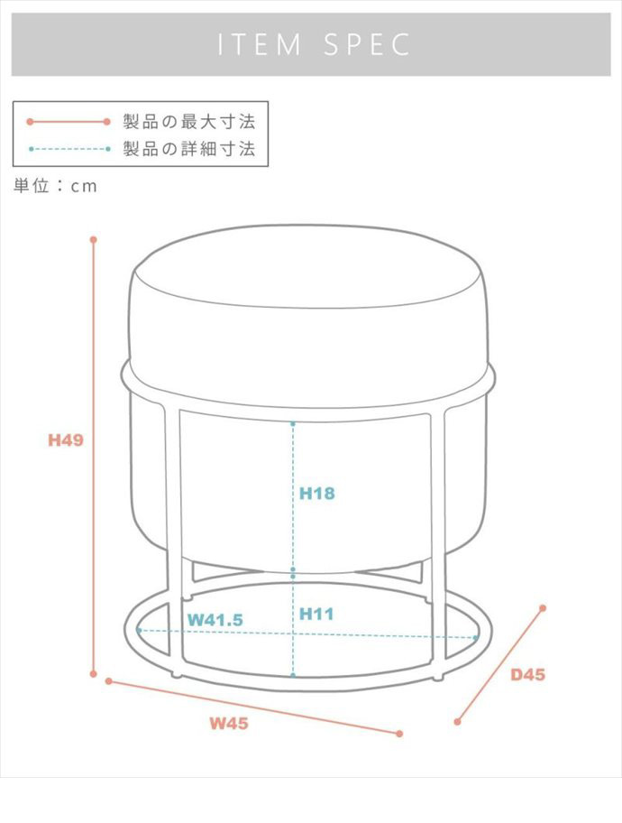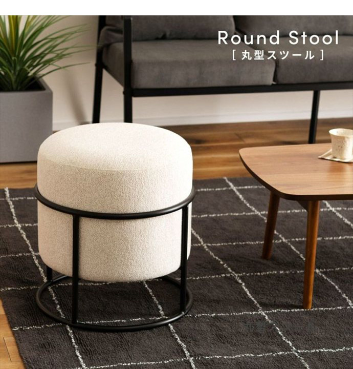 コロンとした丸型の座面と、シャープなブラックスチール脚の組み合わせが目を惹くスツール。座面は弾力のあるクッション性で、体重をしっかり支えつつ、やや硬めで立ち座りを快適に行えます。直径45cmの広々とした座面で、ゆったりと余裕のある座り心地を実現しました。またスタッキングが可能で、使わないときは省スペースにまとめられるため、すっきりとした空間を保てます。