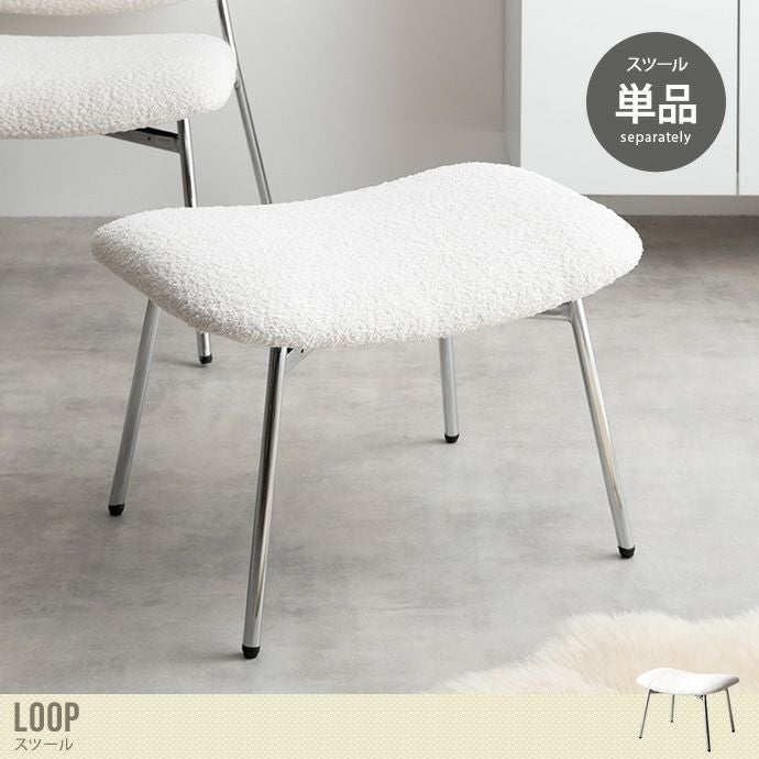 上質な空間でリラックスできる、デザイン性の高い『Loop(ループ)』スツール。モコモコ生地×シルバー脚のデザインは、空間のアクセントになります。また座面は、傾斜のあるフォルムで沈み込みの少ない幅広・奥広設計。シリーズのラウンジチェアと合わせて、オットマンとしても使用可能です。デザイン性だけでなく、座り心地も抜群で心地いい時間をお過ごしいただけます。