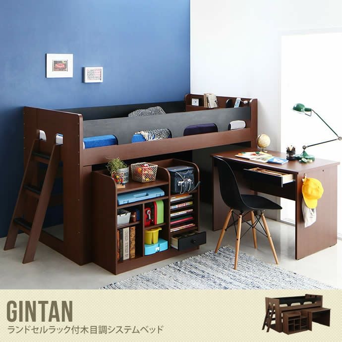 『Gintan ギンタン』子供がすくすく育つランドセルラック付き木目調システムベッドは、すのこ仕様のロフトベッドに、収納力抜群のランドセルラックと天板を広々使えるデスクが付いた3点セットです。ランドセルラックには、4つの収納スペースがあり、ランドセルが置けるスペースがあるのはもちろん、収納したいものに合わせて自由にカスタマイズができます。狭い部屋でも子供部屋が作れます。落ち着いた色合いのブラウン×ブラックです。