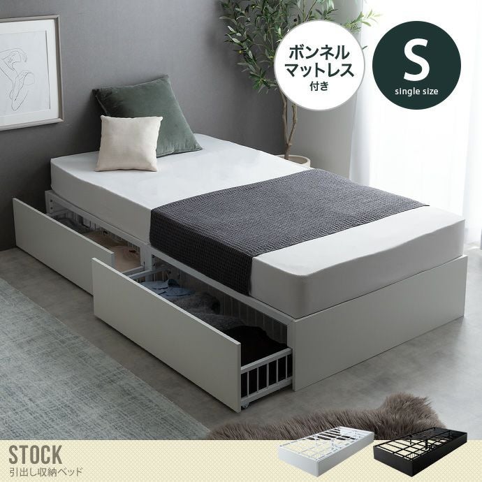 【送料無料】Stock ストック 幅98.5 シングル 【ボンネルコイルマットレス付き】 ベッド パイプベッド ベッドフレーム おしゃれ おすすめ フレーム すのこ型 メッシュ 引き出し 収納 ボンネルコイル マットレス付き セット 宮無し 一人暮らし ワンルーム 通気性