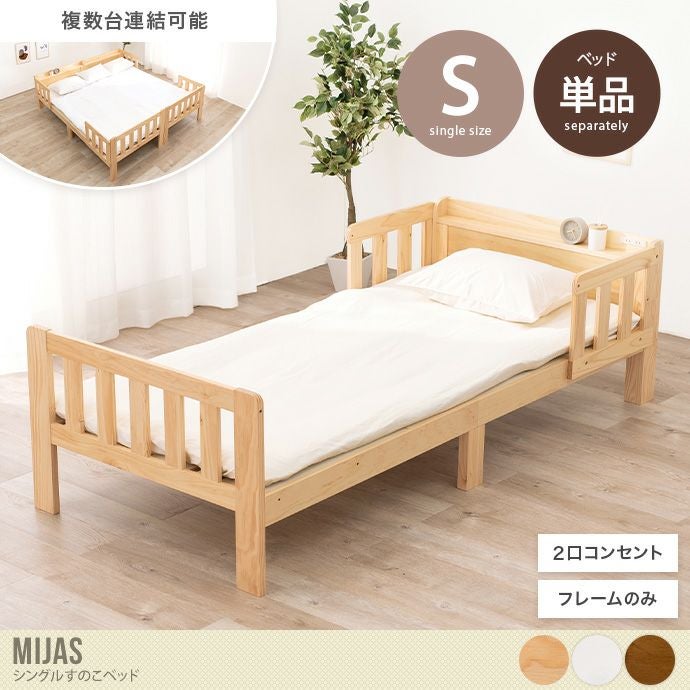 同シリーズで揃えればベッド同士を連結できる『Mijas(ミハス)』シングルすのこベッド。一人で使用する際はシングルベッドとして、家族で使用する際は複数台を連結して広々使えるキングサイズベッドとしてお使いいただけます。一般的なシングルベッドより大きめで、敷布団がぴったり収まる設計です。またベッドボードが付属しているため、動き回るお子様や布団をしっかりガードし、落下を防ぎます。
