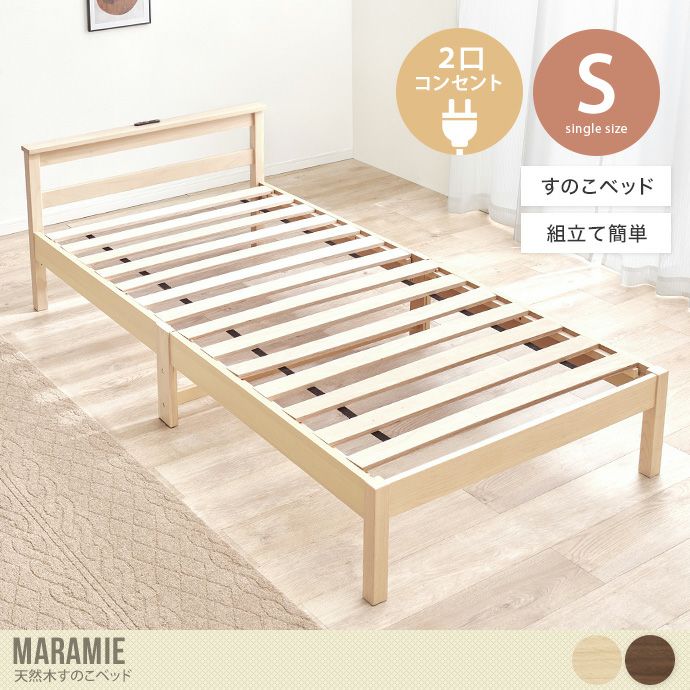 シンプルなデザインが特徴の『Maramie(マラミー)』すのこベッド。通気性に優れたすのこ床は、湿気がこもりにくく、いつでも衛生的に使用可能。またヘッドボードには2口コンセント付いているため、スマホの充電やライトも設置していただけます。さらにネジや工具を使わず、ひっかけるだけで簡単に組み立て可能。組み立てが苦手な方にもおすすめです。