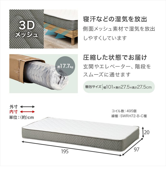 【マットレス】幅97cm×奥行195cm×高さ20cm(コイル数:495)