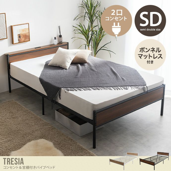 【送料無料】Tresia トレシア 幅120 セミダブル 【ボンネルコイルマットレス付き】 ベッド パイプ ローベッド おしゃれ おすすめ 安い フレーム マットレス付き ヘッドボード 宮棚 コンセント ベッド下収納 かっこいい 湿気対策 通気性 一人暮らし ワンルーム 高さ調節