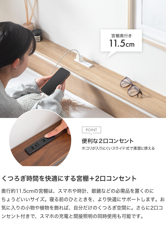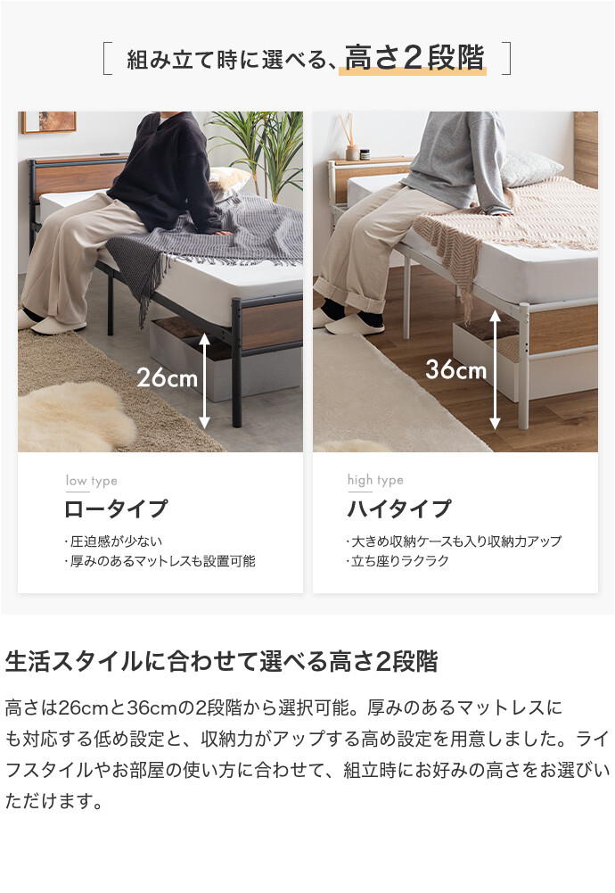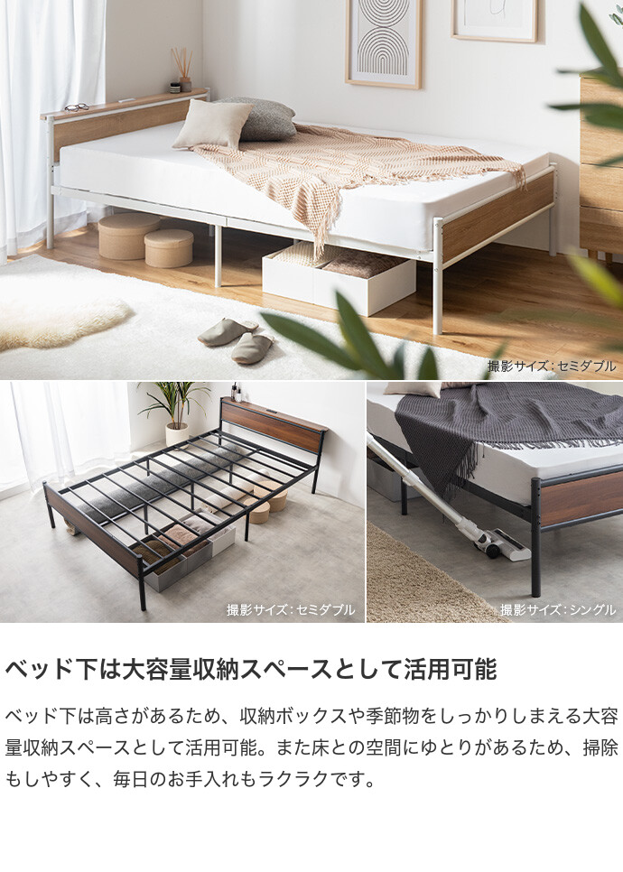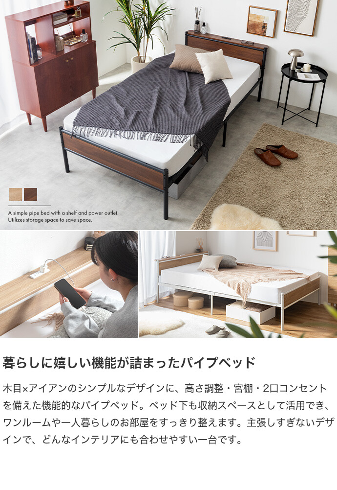 木目×アイアンのシンプルなデザインに、高さ調整・宮棚・2口コンセントを備え、毎日の使いやすさにこだわったパイプベッド。ベッド下を収納スペースとして活用できるため、お部屋を広く使え、ワンルームや一人暮らしでもすっきりとした空間作りが叶います。主張しすぎない佇まいでインテリアを選ばず、暮らしに自然と馴染む一台です。