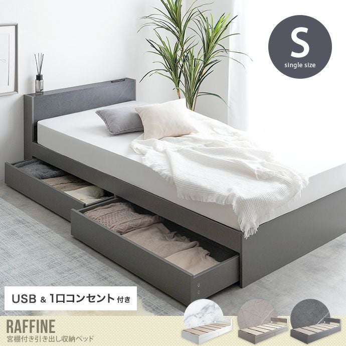 ストーン柄が高級感漂う宮棚&コンセント付き引き出し収納ベッド。ヘッドボードに施されたストーン柄のアクセントが、お部屋を洗練された空間に導きます。またベッド下には大容量の引き出しが2杯付属。スペースを有効活用できるため、すっきりとした美しい空間を演出します。