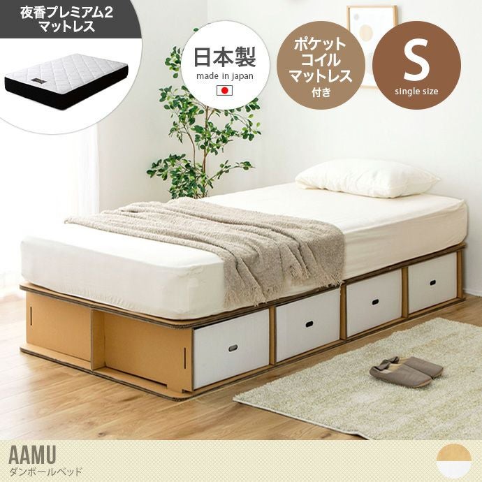 軽量で手軽に使用できる『Aamu(アーム)』ダンボールベッド。3層構造の頑丈設計で耐久性抜群。底板があることで、安定感があり横揺れを軽減してくれます。使わなくなったら、ダンボールとして破棄ができるため処分も簡単。短期でのお引越し予定の単身赴任の方や、学生の方などにもおすすめです。またセットの日本製ポケットコイルマットレスは体圧分散性にすぐれており、通気性も良いため快適に使用可能。厚みは26cmとしっかりあるため底つき感がなくしっかりと身体を支えてくれます。
