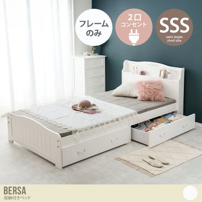 【送料無料】幅85 ベッド 収納付きベッド すのこベッド セミシングル ホワイト ショート おしゃれ おすすめ ベッドフレーム 単品 引き出し 2杯 2口コンセント付き 宮棚 上品 大人可愛い かわいい コンパクト 省スペース 一人暮らし