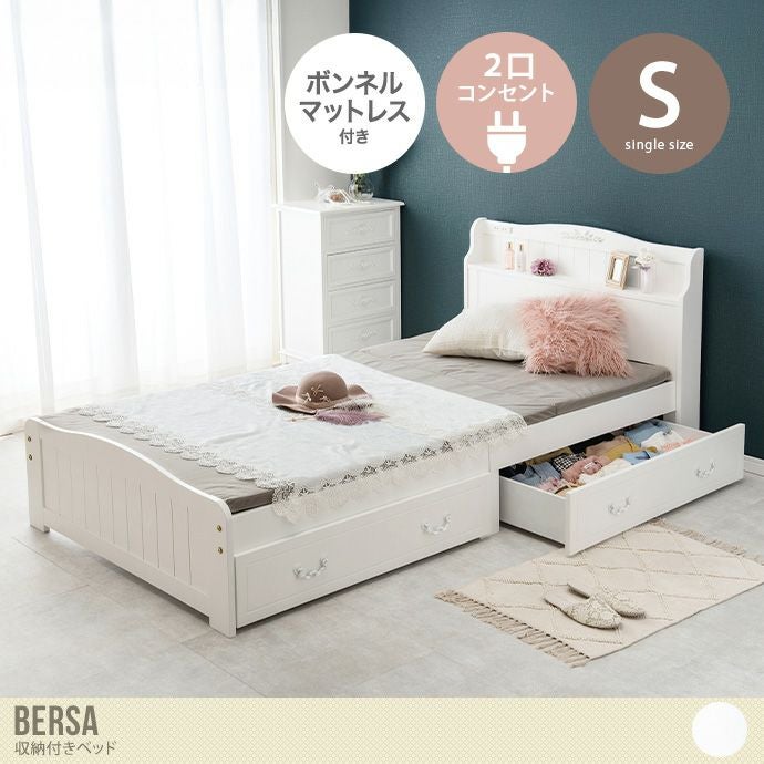 シンプルで上品なデザインが魅力の『Bersa(ベルサ)』収納付きベッド。清楚感のあるホワイトカラーと細部までこだわった装飾が、女性らしい優雅なお部屋を演出します。ベッド下には大容量の引き出し収納が2つ備え付けられており、衣類や小物類をスッキリと整理可能。ベッドフレームには耐久性のある素材を使用しているため、長く安心してご利用いただけます。