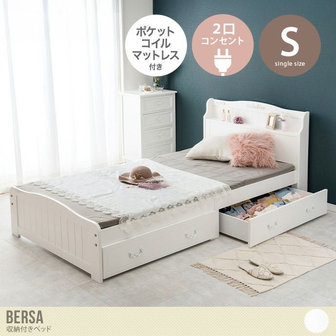 シンプルで上品なデザインが魅力の『Bersa(ベルサ)』収納付きベッド。清楚感のあるホワイトカラーと細部までこだわった装飾が、女性らしい優雅なお部屋を演出します。ベッド下には大容量の引き出し収納が2つ備え付けられており、衣類や小物類をスッキリと整理可能。ベッドフレームには耐久性のある素材を使用しているため、長く安心してご利用いただけます。
