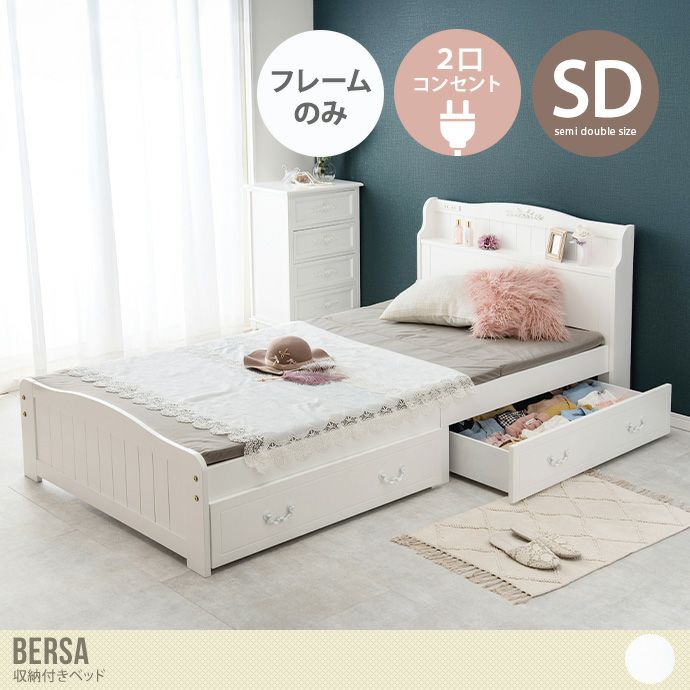 シンプルで上品なデザインが魅力の『Bersa(ベルサ)』収納付きベッド。清楚感のあるホワイトカラーと細部までこだわった装飾が、女性らしい優雅なお部屋を演出します。ベッド下には大容量の引き出し収納が2つ備え付けられており、衣類や小物類をスッキリと整理可能。ベッドフレームには耐久性のある素材を使用しているため、長く安心してご利用いただけます。