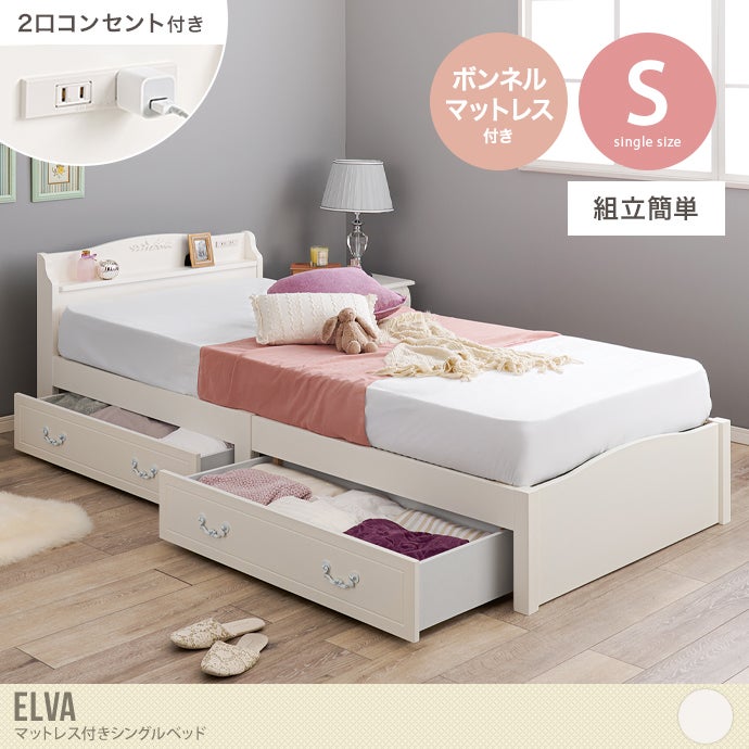 【送料無料】幅98.5 ベッド シングル ホワイト ベッド すのこベッド 収納付きベッド おしゃれ おすすめ 安い マットレス付き シングル ホワイト すのこ コンセント付き 2口 引き出し ボンネルコイル 組立簡単 宮棚 ベッド下収納 一人暮らし かわいい