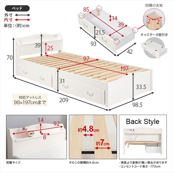 サイズ【ベッド】幅98.5cm×奥行209cm×高さ70cm(床面高:31cm)