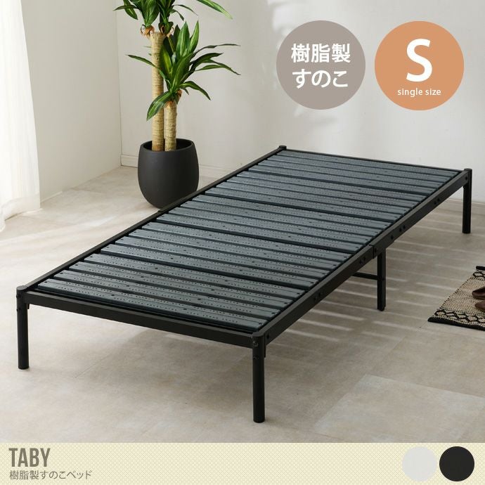 樹脂製のすのこを使用したお手入れ簡単な、すのこベッド『Taby (タビー)』。すのこ板1枚1枚に空気を通す穴が開いており、通気性を確保し水に濡れてもシミなどの変色が少なく日頃のお手入れが簡単になります。フレームはスチールのパイプフレームで、すのこの間隔が2.5cmと密度がある為、耐荷重は120kgと頑丈です。