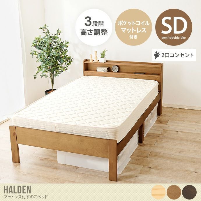 【送料無料】幅120 すのこベッド ベッドフレーム 高さ3段階 宮付き マットレス付き セミダブル ナチュラル ポケットコイル 宮棚 2口 コンセント 木目 ウッド フレーム付き 一人暮らし ワンルーム 同棲 収納