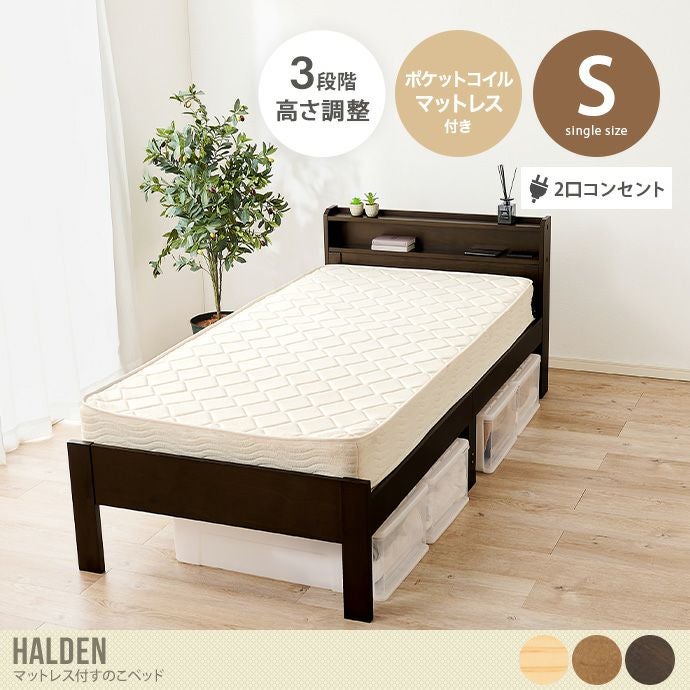 【送料無料】幅98 すのこベッド ベッドフレーム 高さ3段階 宮付き マットレス付き シングル ナチュラル ポケットコイル 宮棚 2口 コンセント 木目 ウッド フレーム付き 一人暮らし ワンルーム 同棲 収納
