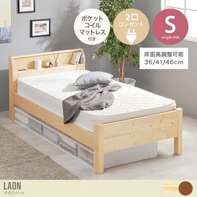 【送料無料】幅100 ベッド すのこ スノコ ポケットコイル マットレス付き セット シングル ナチュラル S コンセント付き 宮棚 収納 大容量 組立簡単 工具不要 高さ調節 耐荷重400kg 充電 スマホ 本棚 パイン材 衣類ケース 通気性